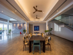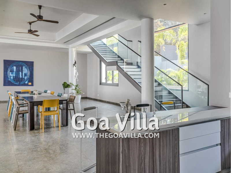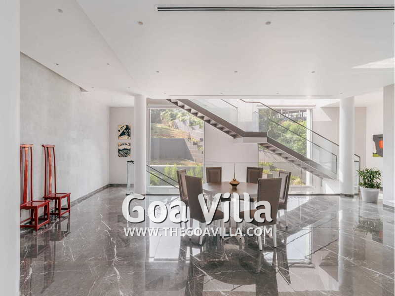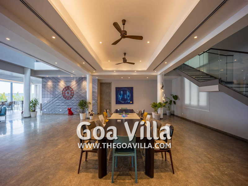 Living Room – Such a large house ought to have several lounging spaces to ensure that it never feels crowded. And rightly so! Villa Eternal Seas has at least two sofa areas, both large, and also several armchairs, and other sitting places. One faces a large-screen television and the second faces the infinity pool and the outdoor terrace. They both provide sitting luxury. Earthen lamps and boutique chandeliers add a unique ambience. The line between outdoors and indoors disappears, thanks to the large glass features, providing openness that you will rarely find in Goa.
