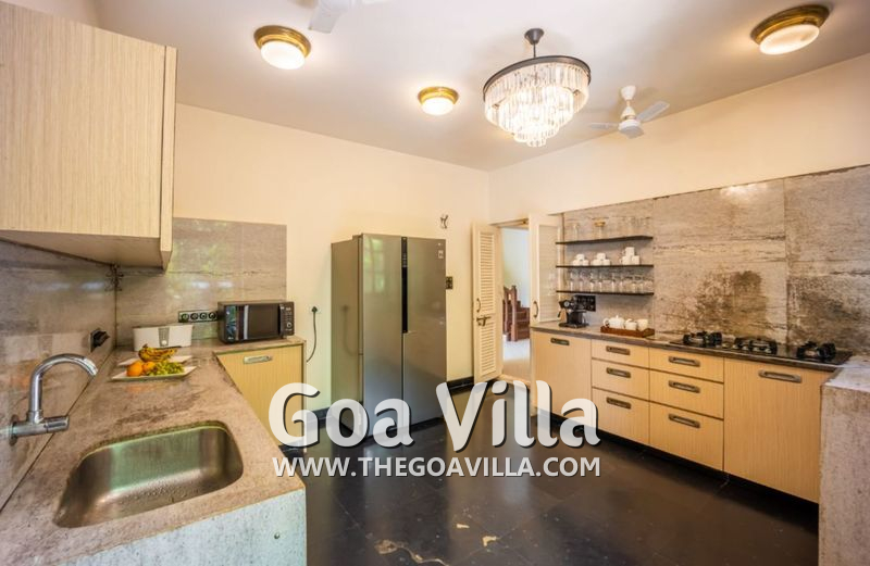 Dining, Kitchen – A 10-seater dining table is placed at one end of the ground floor living room. In a separate room next to this, you will find a fully-equipped kitchen where you can cook yourself or ask for chef service. The kitchen has coffee machine, ice-maker, heavy duty microwave and oven. There is also a 5 burner gas hob.
