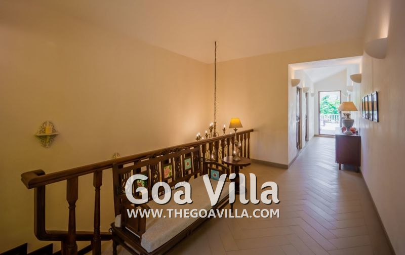 Living Room – You will find several lounging spaces in this villa for rent where you can relax and spend quality time with family or friends. The ground floor features and open-plan concept with two sofas and armchairs on one side and the dining area on the other. Glass doors open from here to a courtyard. There is a second smaller lounging space on the first floor landing. A corridor from here leads to two bedrooms. Villa Fieldscapes also has a wonderful terrace with a cot, sofa, and chairs. The terrace offers a 360-degree view of the surrounding greenery.