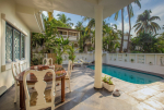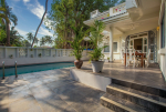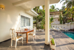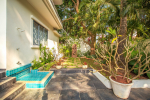 Swimming Pool – Flamingo villa for rent has an outdoor swimming pool with a shallow end. Surrounded by tall trees and lush greenery, it has a stunning setting. There is also a small garden. Recliners are placed beside the pool where you can spend time relaxing. There is outdoor dining too beside the private swimming pool.