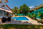 Swimming Pool – Private swimming pool with a shallow end for kids. There is outdoor sitting and a table where guests can have food or relax after a dip. Potted plants all around the pool. Large trees around the property, and a small garden next to the pool.