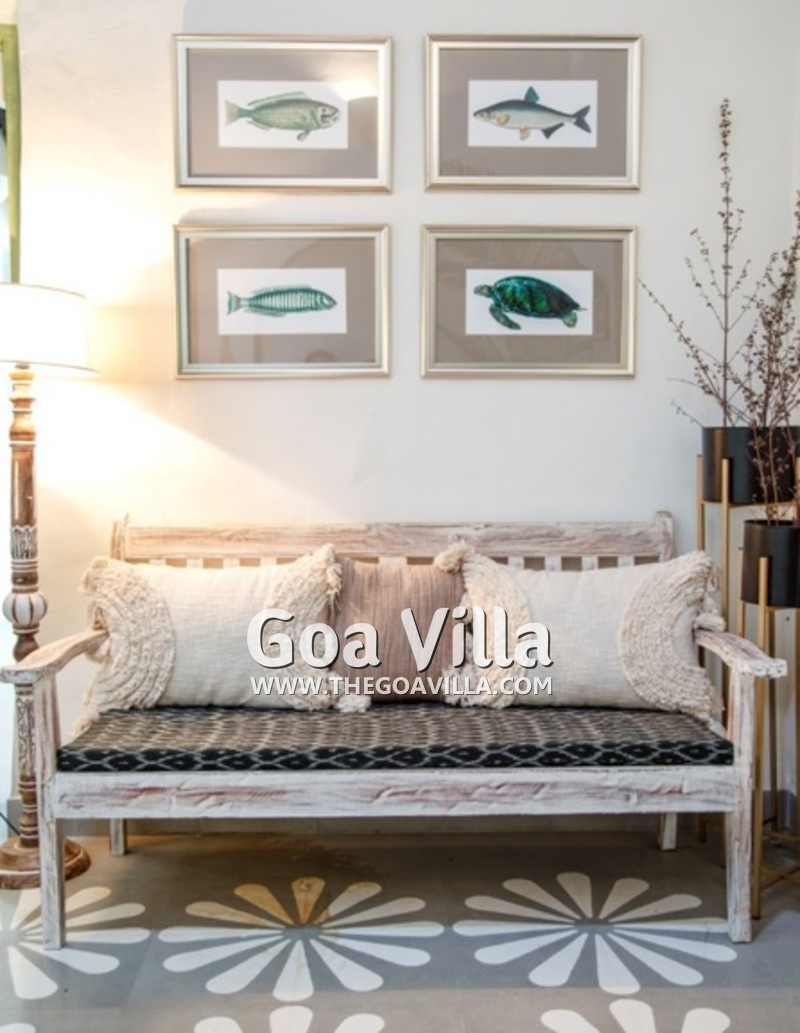 Living Room – On reaching Villa Gracious, you will find a whitewashed building with a traditional tiled roof and a long verandah, which has comfortable armchairs. A door leads to the living room. It is cozy and feels very inviting. The furniture is a mix of modern and antique. You can watch television or plan what to see and where to visit in Goa with your group.