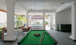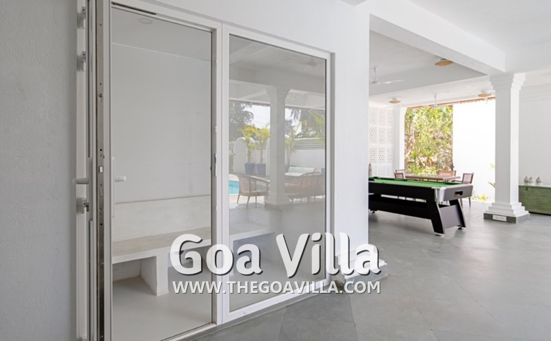 Living Room – This North Goa villa for rent has a huge open-concept room, which has the formal living area. You will find a beautifully laid-out seating area with an antique sofa and a rustic coffee table. One entire wall, just behind, has a window that provides views of the swimming pool. There is a second lounging space in the games room with a sofa. This room has a pool table, cards table, and a steam room.