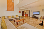 Living Room – Huge living space with sitting for 12 people, center table, television, TV unit, imported marble, balcony with views, paintings, potted plants.