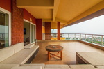 Infinity is a 5-bedroom villa at Candolim in North Goa. It is on a hill close to the Reis Magos Fort, overlooking the confluence of the Mandovi River and the Arabian Sea. Coco beach is just 1.07 kilometers away. Candolim beach is at a distance of 3.58 kilometers. Modern bright exterior. Spacious interiors with wooden furniture. Swimming pool with sun loungers. Small garden. Luxury services.