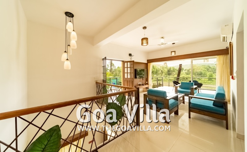 Living Room – Villa Kimaya has two living rooms, one on each level. So, it is never going to feel crowded even when all the guests are inside the house. The ground-floor living room has a sofa and an impressive balcony with a second seating area. A door from here leads to the pool terrace. The second living room is on the upper level. This room has a television and a deep-cushioned sofa. It is open on two sides, which will impress you the most. An entire wall opens to the balcony. There is a large door also on the second wall, which opens to another balcony.