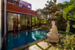 Swimming Pool – Outdoor pool with trees all around. Traditional Indian bamboo chairs and table. Statue of Buddha.