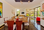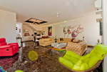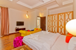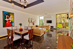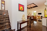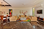 Living Room – Air-conditioned living are with vibrant furniture. Sofa, recliner, center table, carpet, brightly painted walls, chandelier, statues, paintings. The living room opens to the private swimming pool.