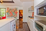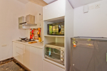Kitchen, Dining Area – Open kitchen with stove, microwave, toaster, refrigerator, kettle, water purifier, chimney, utensils. Wooden dining table offers seating for 6.