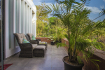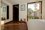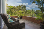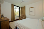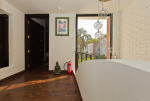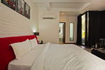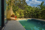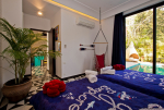 Bedrooms – Villa LPK has 3 bedrooms. They are all air-conditioned and en-suite. The ground floor has 1 bedroom, while the 2 others are at the upper level. Large ceiling-to-floor glass window of the ground floor bedroom offers unobstructed pool views. It has a swing twin beds. Potted plants. The upper floor rooms have king beds, a small library, and romantic lighting. Carpet and paintings on the wall. Luxury recliners. They have hardwood flooring. There is a balcony outside with cane furniture.