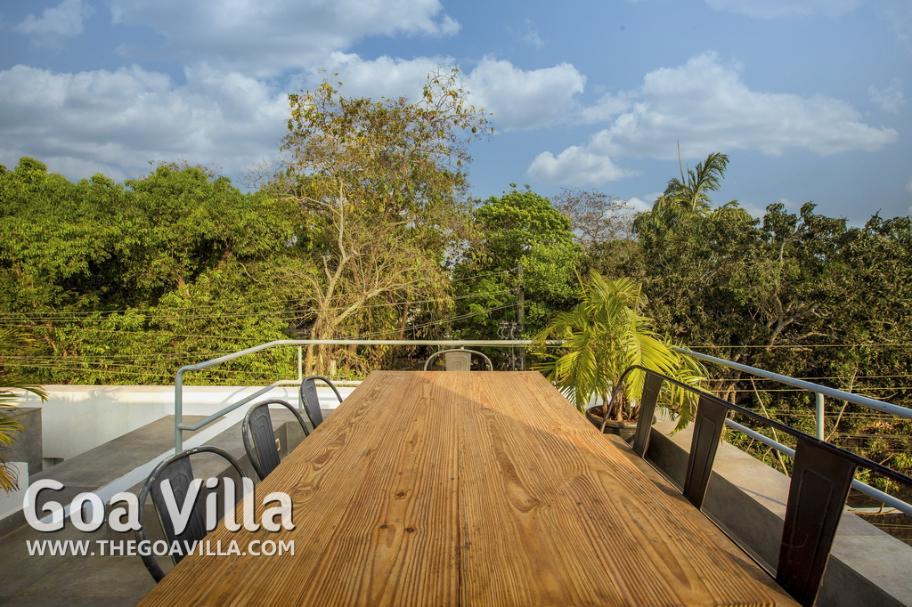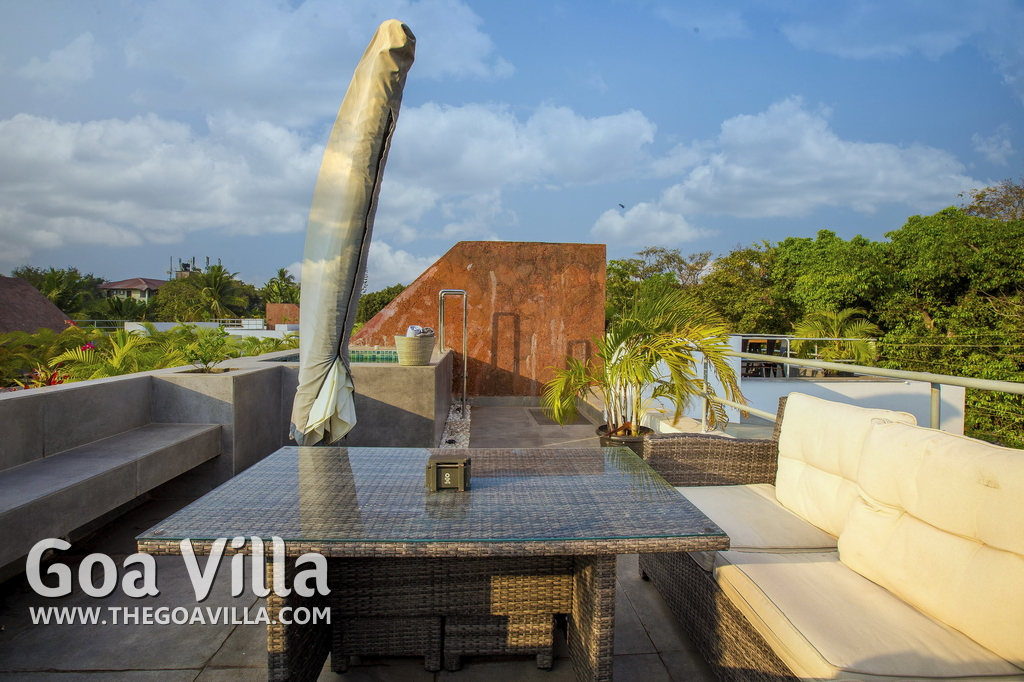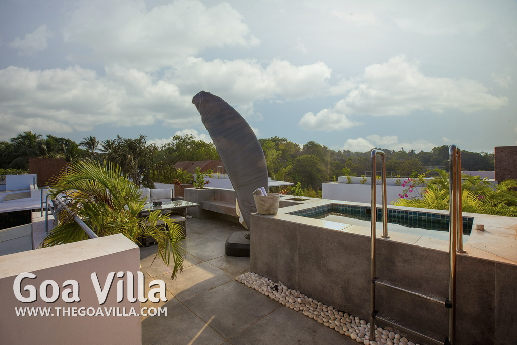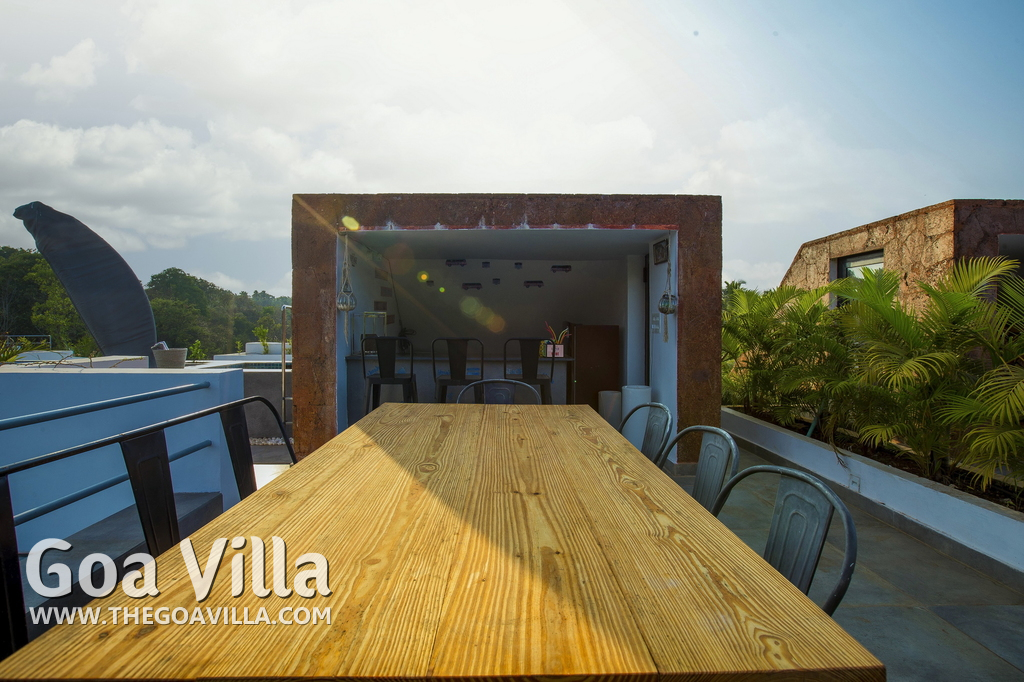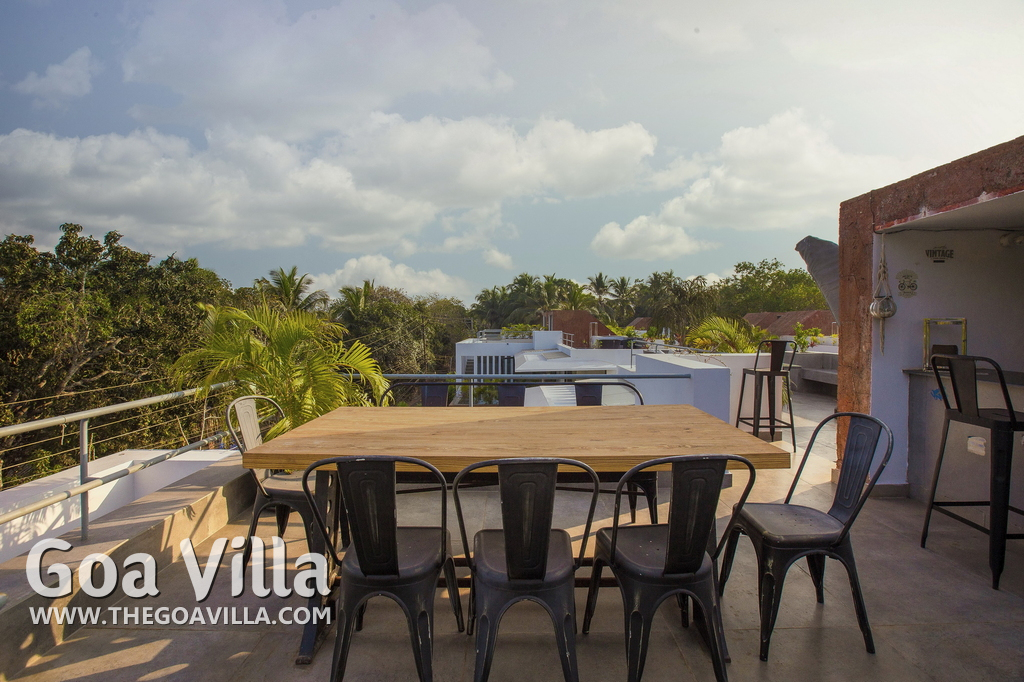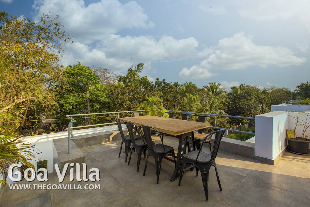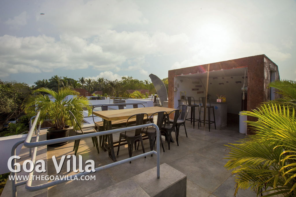 Swimming Pool, Terrace – It is a cozy swimming pool with a shallow end. There are tall trees all around and chairs where you can relax after a dip. The rooftop terrace is a pride of this North Goa property. There is a large sofa under umbrella cover where you can sit and enjoy nature views. There is also a table for enjoying outdoor food, a small bar, and a rooftop Jacuzzi.