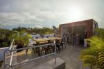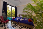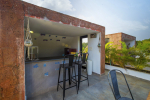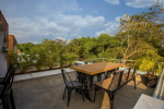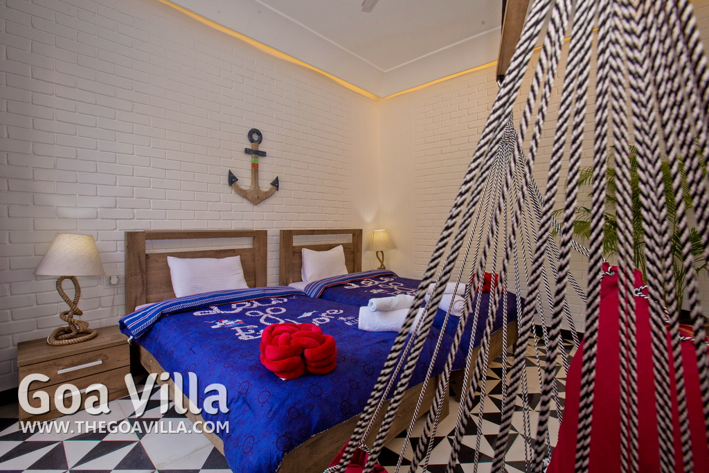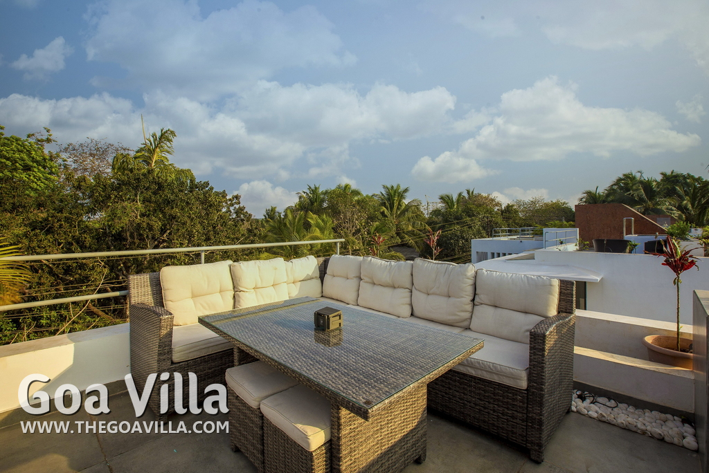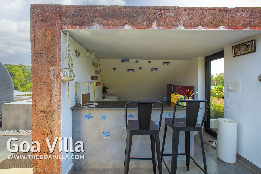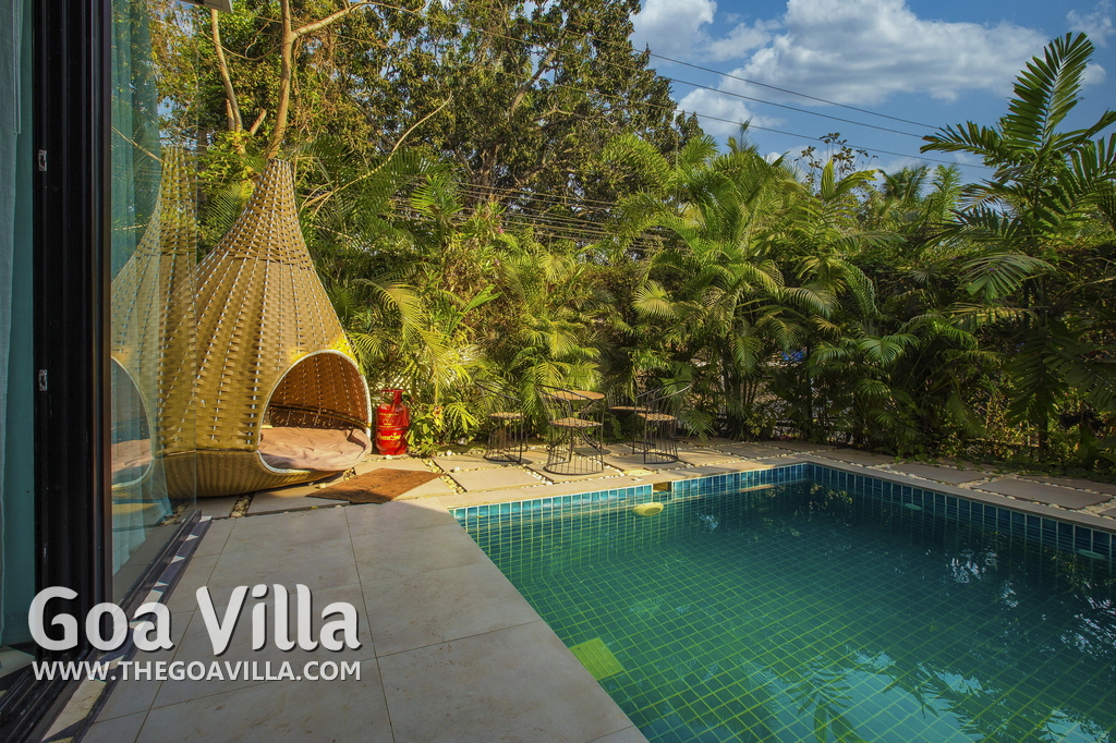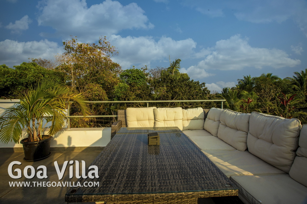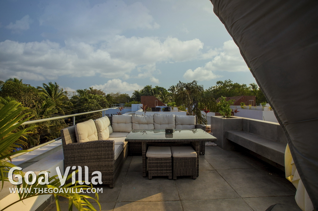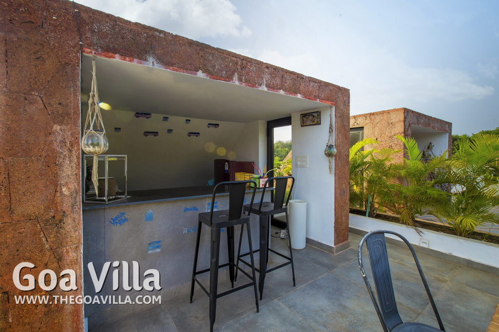 Swimming Pool, Terrace – It is a cozy swimming pool with a shallow end. There are tall trees all around and chairs where you can relax after a dip. The rooftop terrace is a pride of this North Goa property. There is a large sofa under umbrella cover where you can sit and enjoy nature views. There is also a table for enjoying outdoor food, a small bar, and a rooftop Jacuzzi.