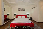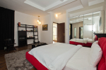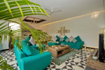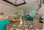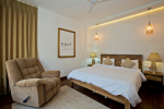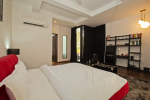 Living Room – LPK’s ground floor living room is a good place to spend quality time. There are 2 large L-shaped sofas in vibrant colors, recliners, television, and paintings. A modern chandelier hangs from the top. Open the ceiling-to-floor glass door to reach the swimming pool or keep it closed when you have the air-conditioning working. Staircase leads to the first floor from one side.