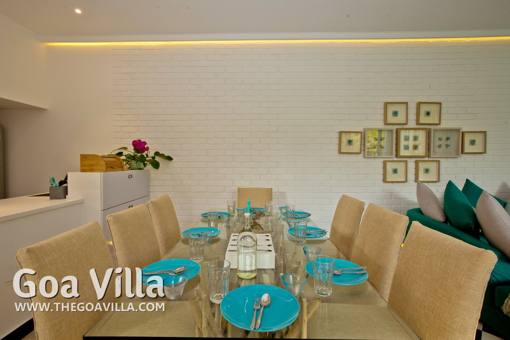 Dining, Kitchen – The dining area is at one side of the open-plan living room. There is a glass-top table with sitting for 8 guests. Comfortable chairs. The well-equipped kitchen has a stove, microwave, toaster, refrigerator, kettle, water purifier, and chimney. Utensils, glasses, and cookware is provided.