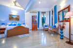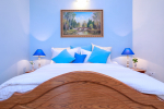 Bedroom #3 – the Blue room (225 sq. ft, 21 square meters). Beautiful ambience and modern décor. Flowers, cushion, furniture.