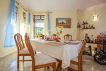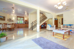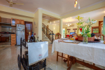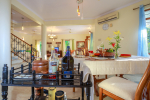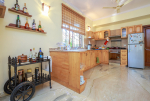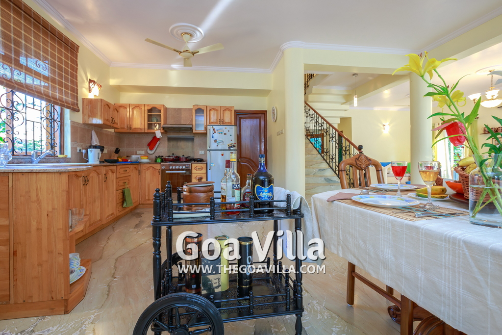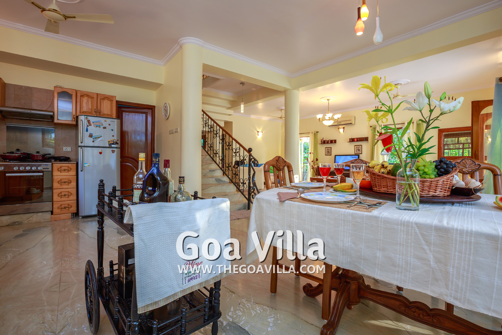 The living room is tastefully decorated. Sit cozily on the Italian design sofas and divan and enjoy the garden and pool view. There is a flat screen television and DVD player where you can watch English, Hindi, and Russian movies. A staircase leads to the first floor. The open kitchen is fully equipped. There is a store room too. Separate dining area with Burma teakwood dining table.
