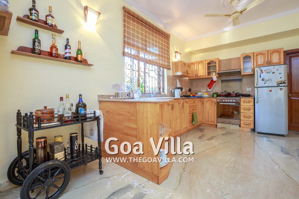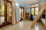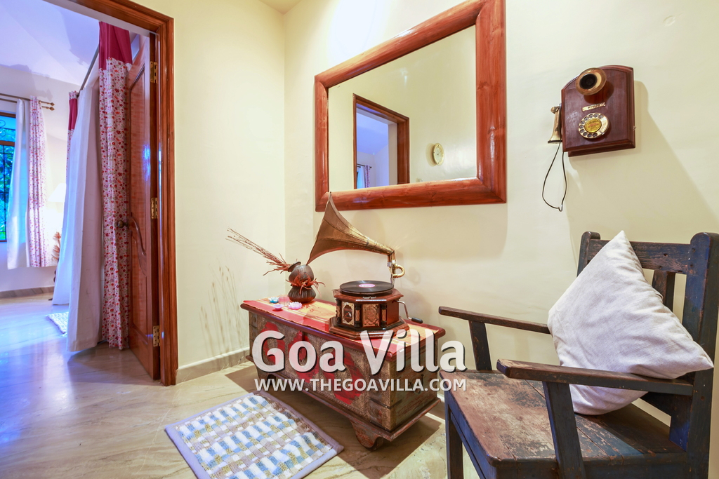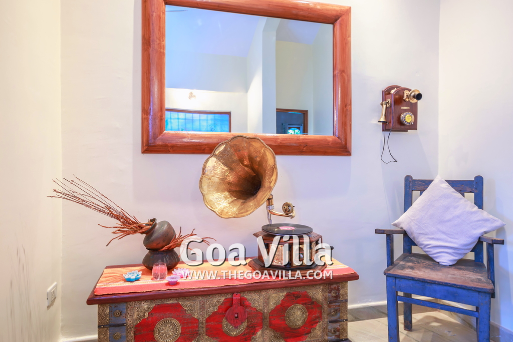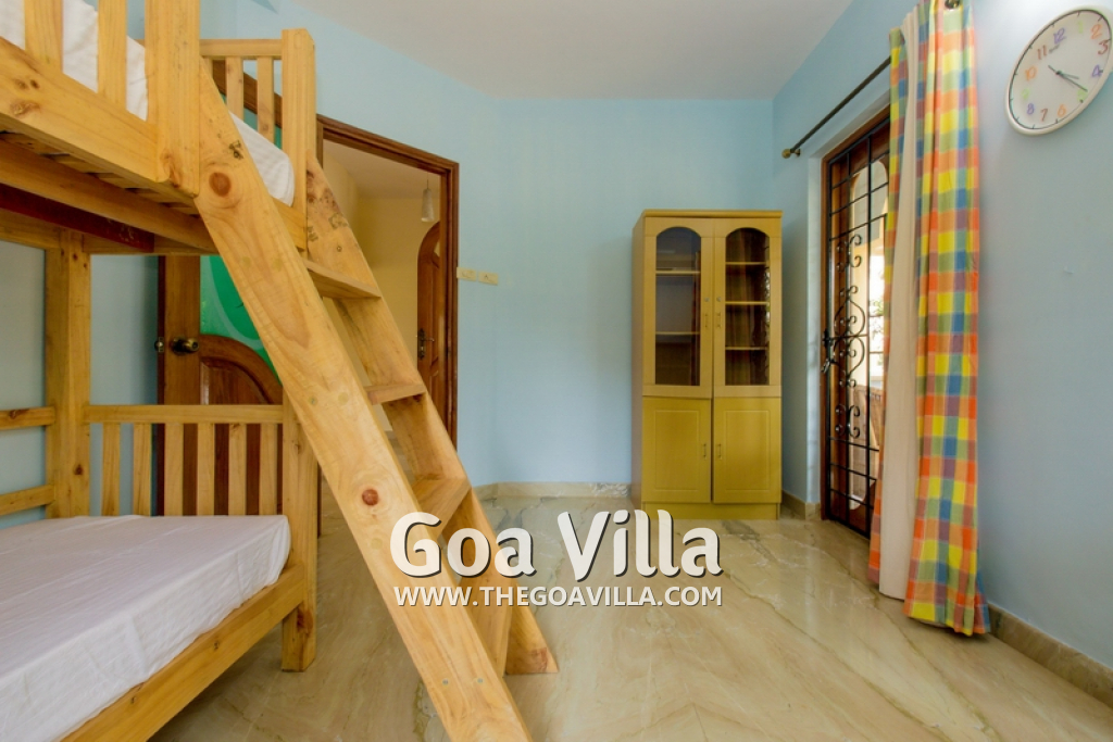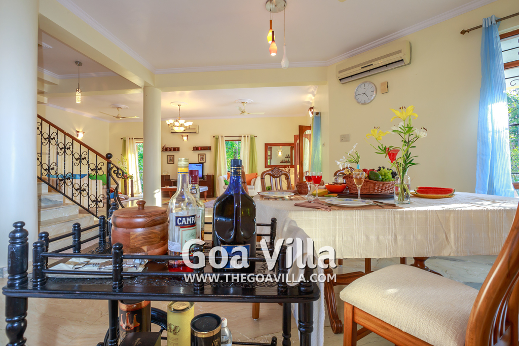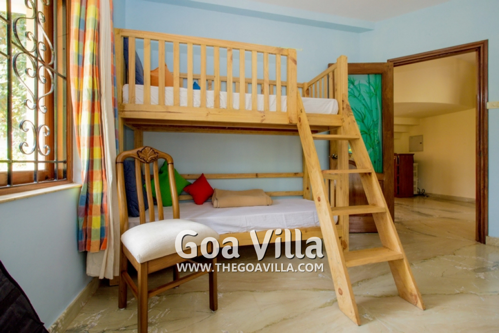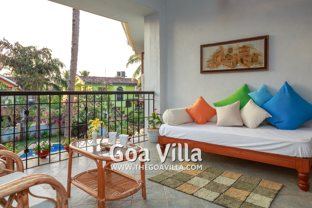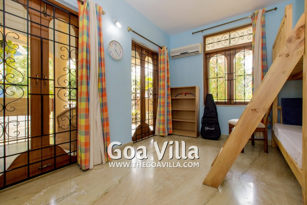 This beautiful villa in Colva has 4 bedrooms, one of them en-suite. There is a kid’s room on the ground floor with musical instruments and toys to keep them busy for the times when they are not playing in the garden. The 3 other bedrooms all come with balconies that offer stunning views of the green neighborhood, the beautiful lawn and private swimming pool. They have comfortable beds, modern furniture and just the right ambience for a relaxing and enjoyable Goa vacation.