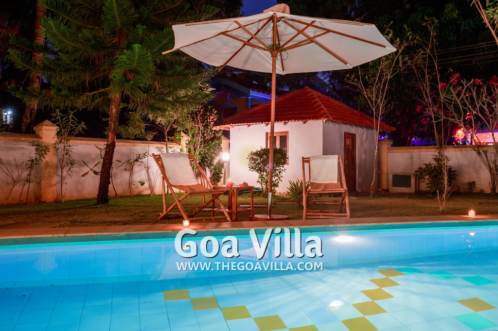 Enjoy the best of nature and leisure at this luxury villa for rent in Colva. Just a few minutes from the beach, this luxury Goa villa will give you the best of everything – a luxurious garden with plants and swaying trees, a private swimming pool with loungers, outdoor garden sitting to enjoy the nature and relax, beautiful lighting for a romantic ambience in the evening, and all the luxuries and amenities fit for a modern lifestyle.