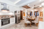 - The kitchen is fully equipped with all appliances and utensils for quick meals and a dining table with chairs.