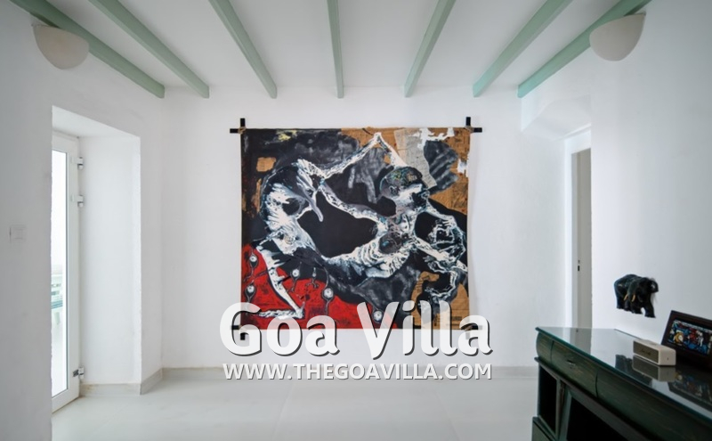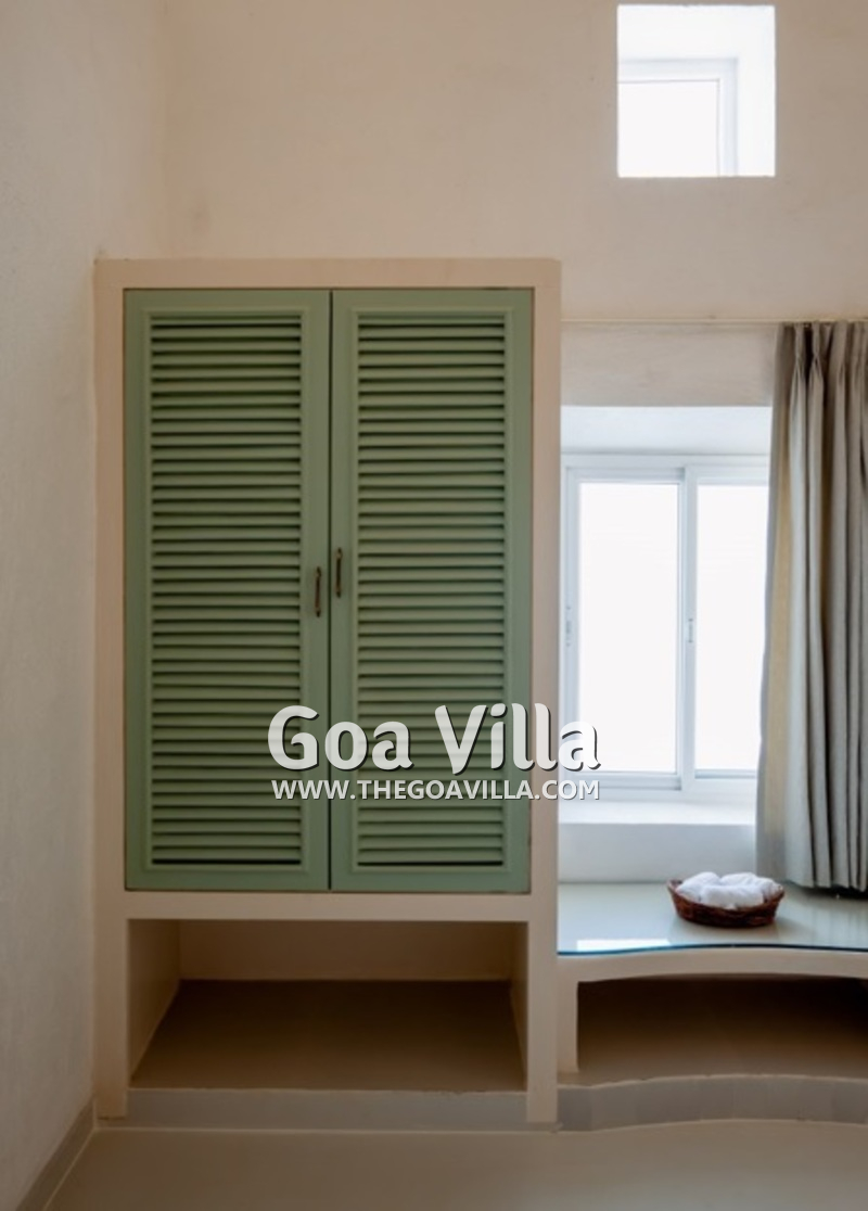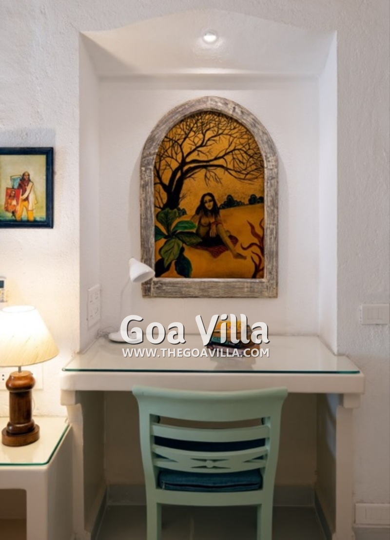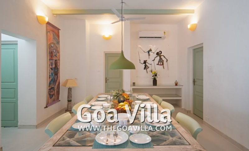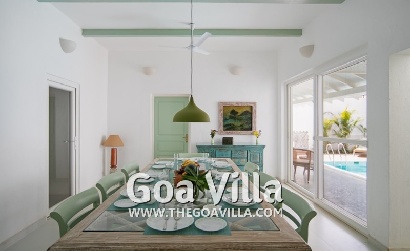 Dining, Kitchen – The formal dining area is in a separate room. It has a glass-top table with 8 chairs. There is an antique chest of drawers and a beautiful chandelier. A wide glass door opens to the pool terrace. You don’t have to cook when you stay in this North Goa villa for rent. The house has a full-time cook who will prepare your meals. You can ask the person to prepare some Goan and Konkani specialties.