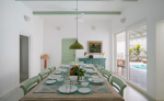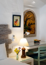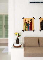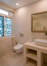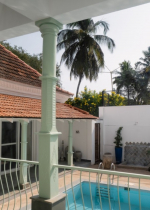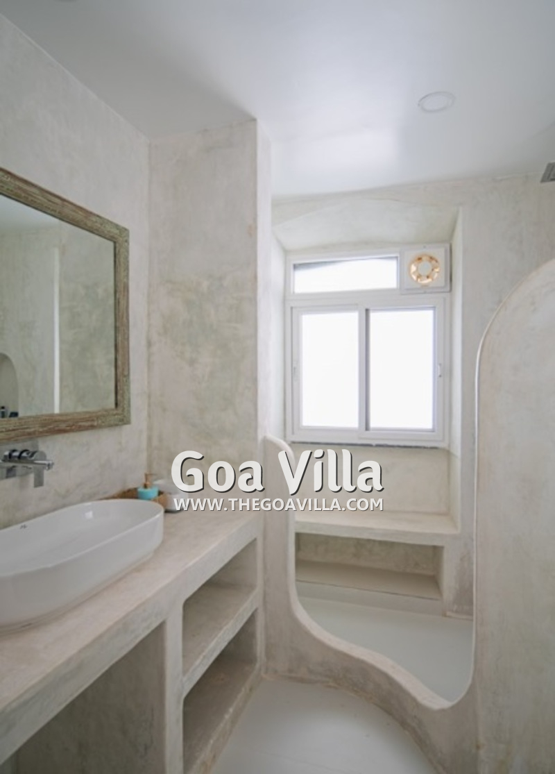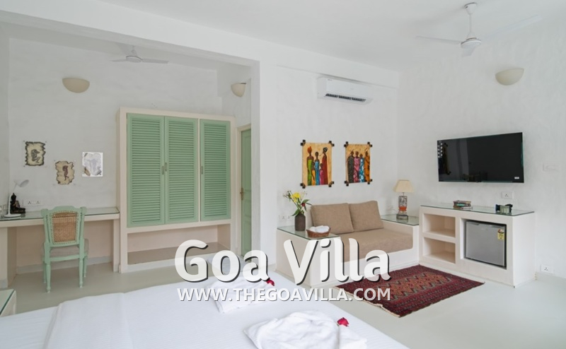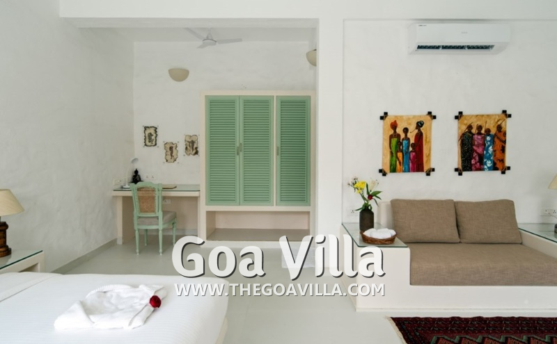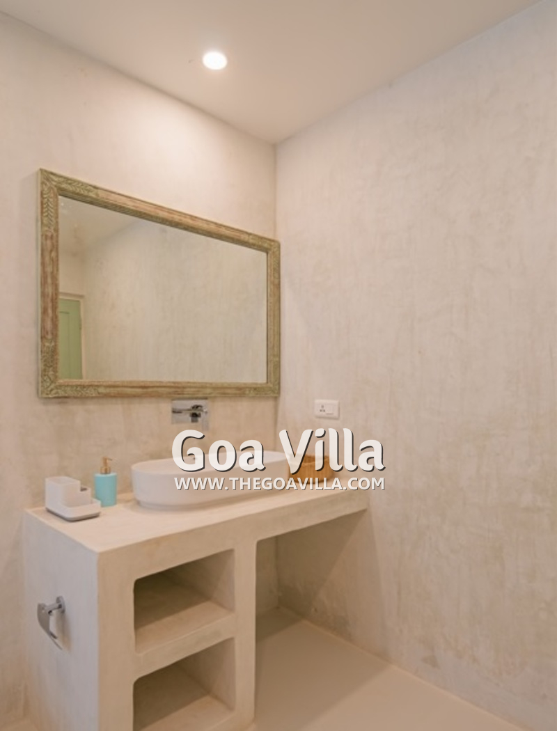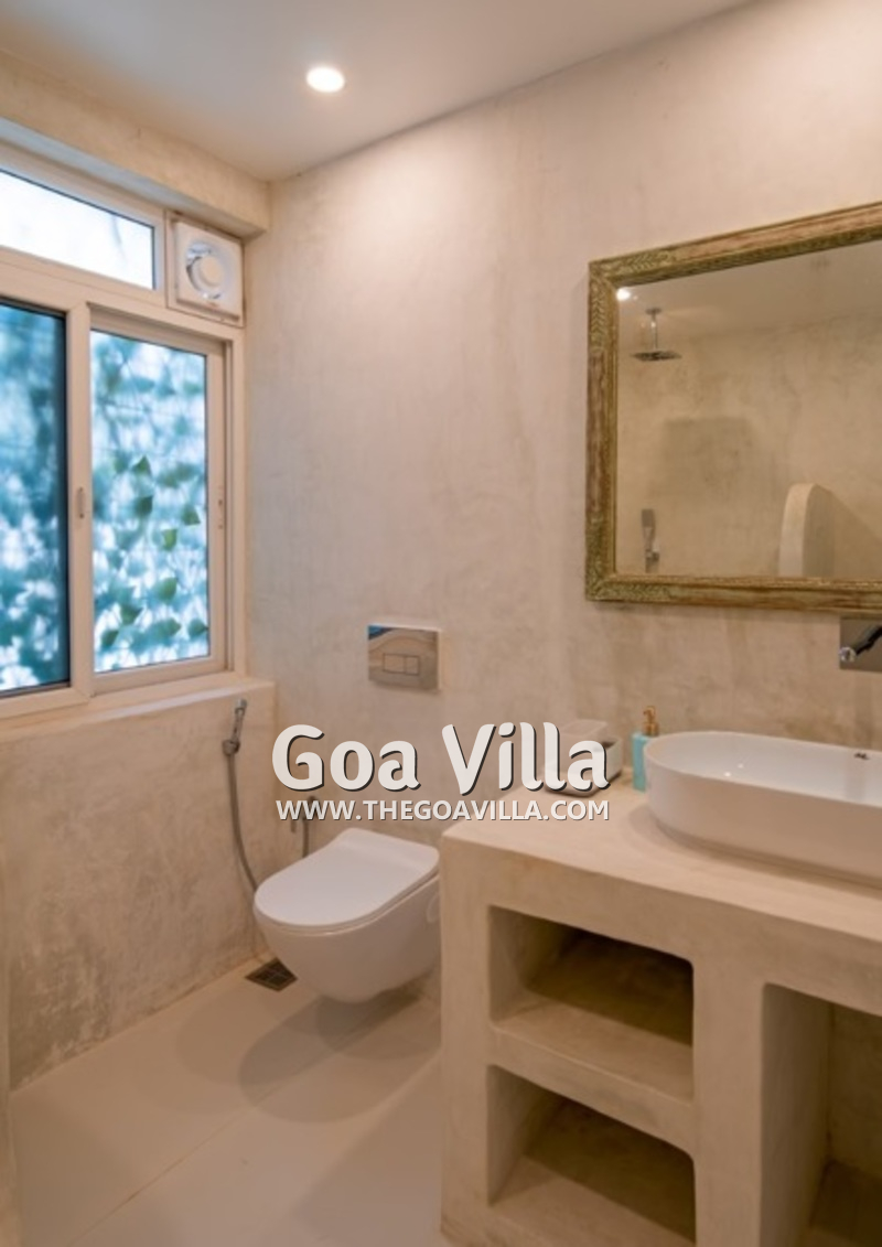 Dining, Kitchen – The formal dining area is in a separate room. It has a glass-top table with 8 chairs. There is an antique chest of drawers and a beautiful chandelier. A wide glass door opens to the pool terrace. You don’t have to cook when you stay in this North Goa villa for rent. The house has a full-time cook who will prepare your meals. You can ask the person to prepare some Goan and Konkani specialties.
