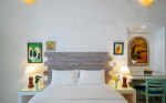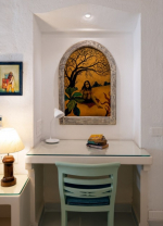 Living Room – Enter the house through the impressive gate and you will reach the large living room. The interior has antique furnishings and a wooden-beamed ceiling, which will transport you back by several decades. The tiled ceiling, thick walls, and arched doors and windows are typical examples Goan-Portuguese architecture. The room offers plenty of seating space. Paintings decorate the walls.