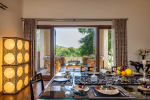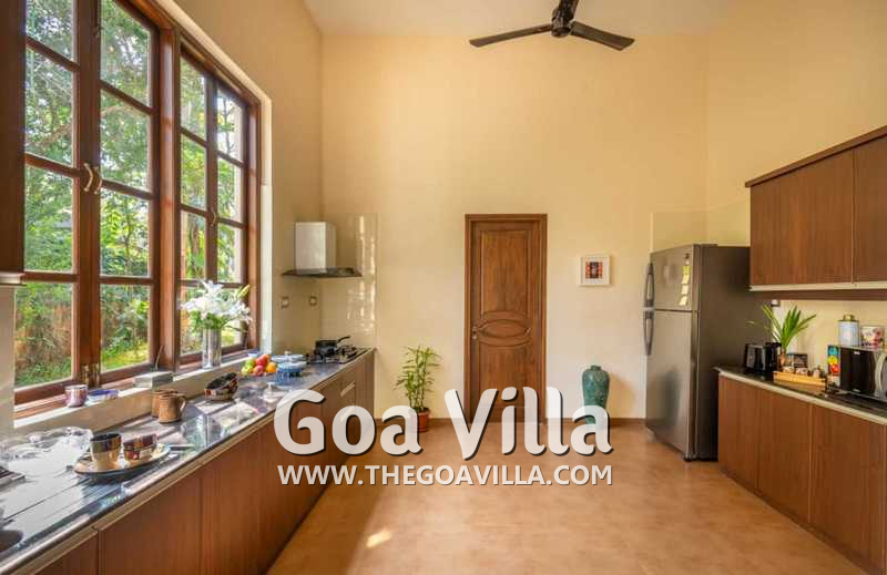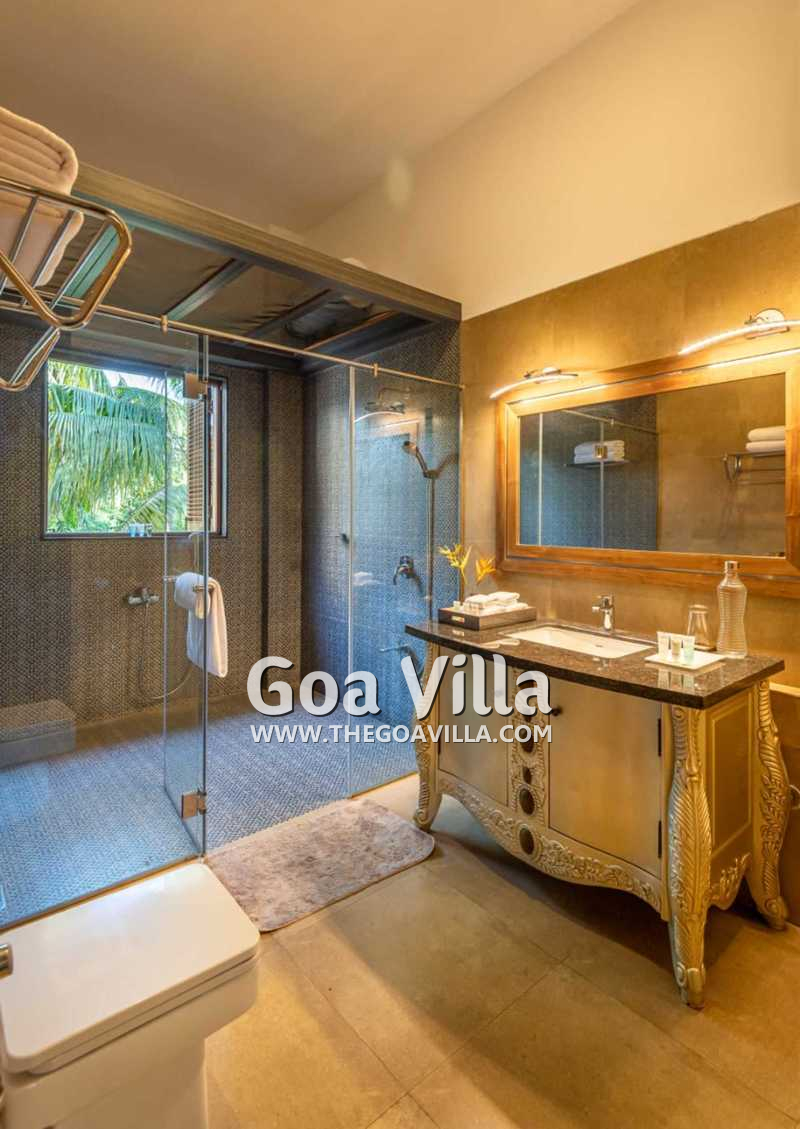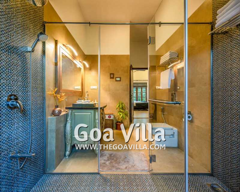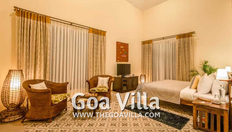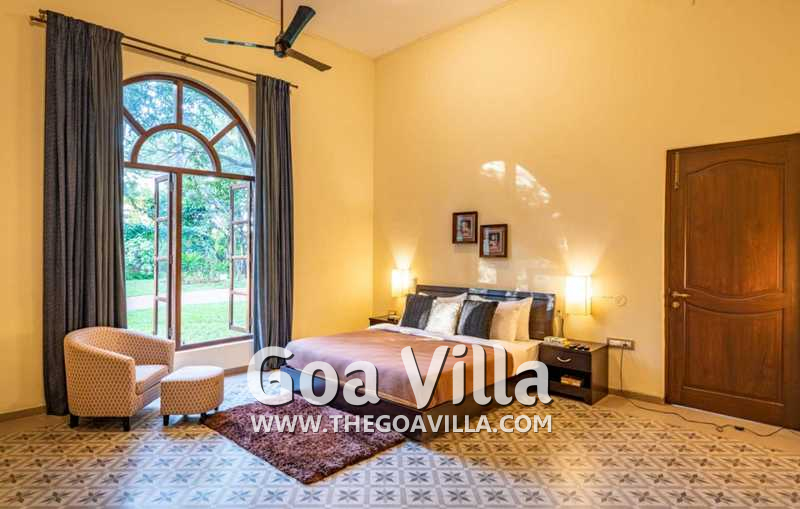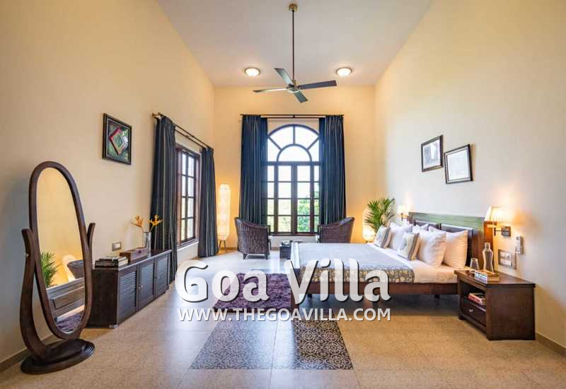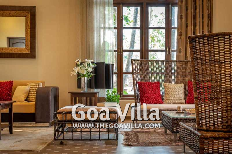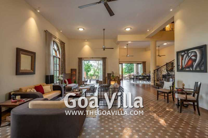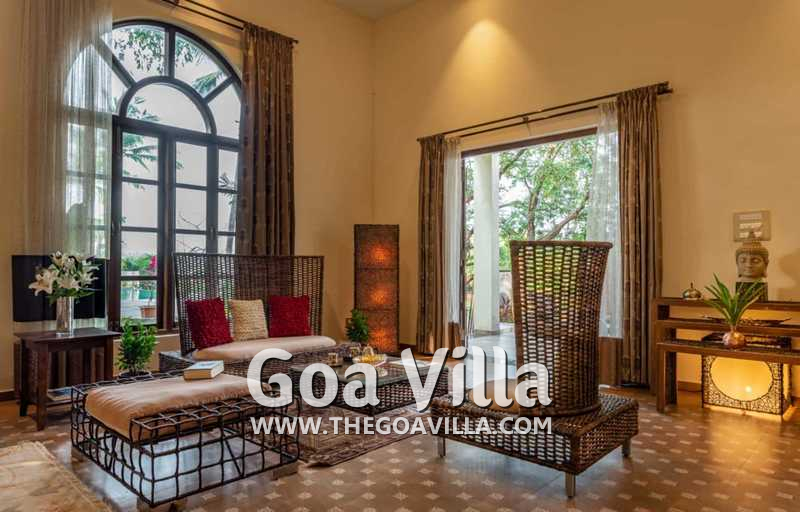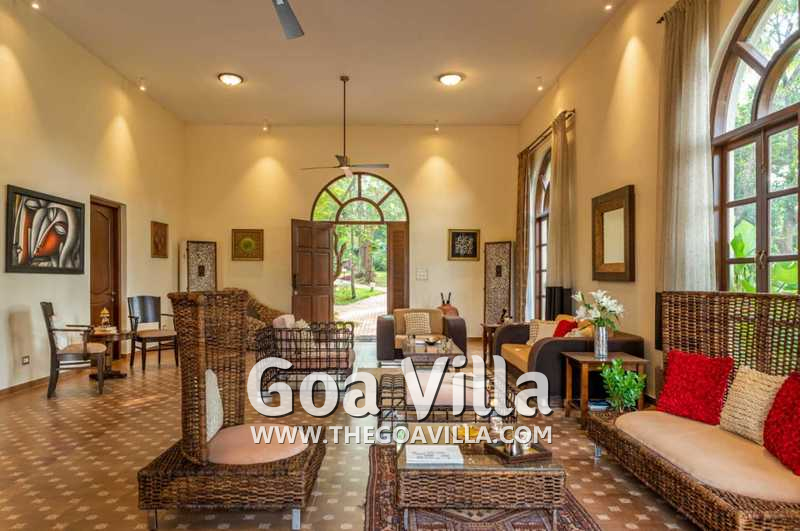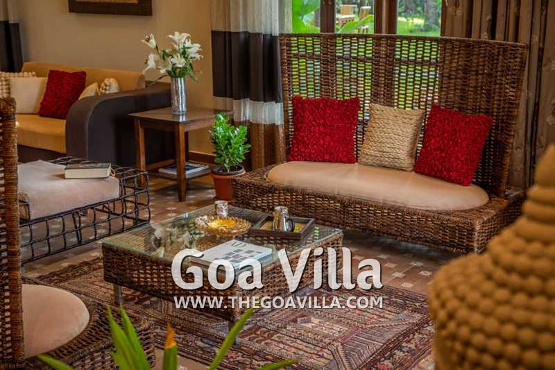 Bedrooms – With 8 bedrooms, this North Goa property is a great choice for a large group that wants to holiday together. You can stay here for an annual holiday with the entire family or a reunion of friends. All the bedrooms have king beds with crush linen and extra cushions for comfort. They are huge. Large French windows offer beautiful views of the garden. There are satellite televisions, wardrobes with hangers, seating areas, and designer lamps in each bedroom.