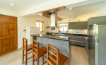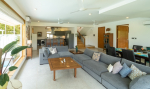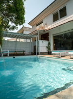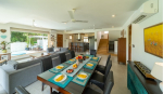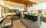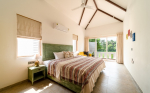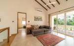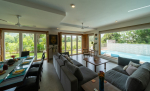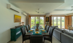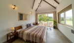 Dining, Kitchen – The 8-sitter dining table is placed just behind the living room sofa. You will several air-conditioners, thus ensuring adequate cooling for this large space. A second glass door from here leads to the garden and pool. It also offers views of the countryside. The kitchen has a double-door refrigerator, an oven, washing machine, and other appliances. There is also a breakfast table with high chairs.