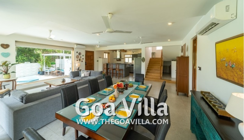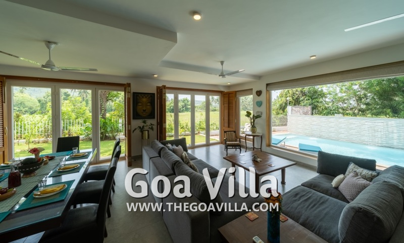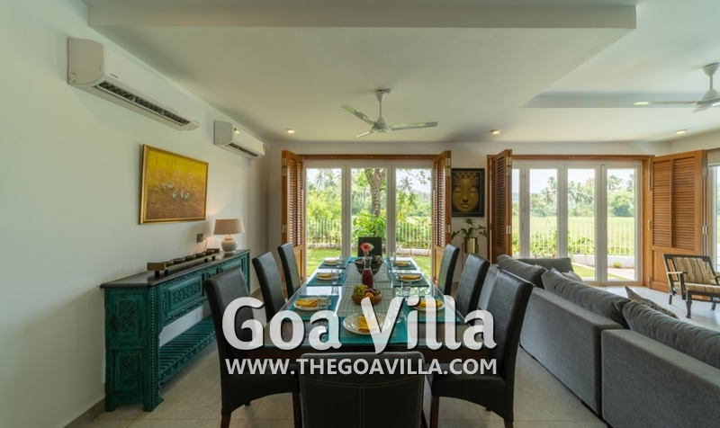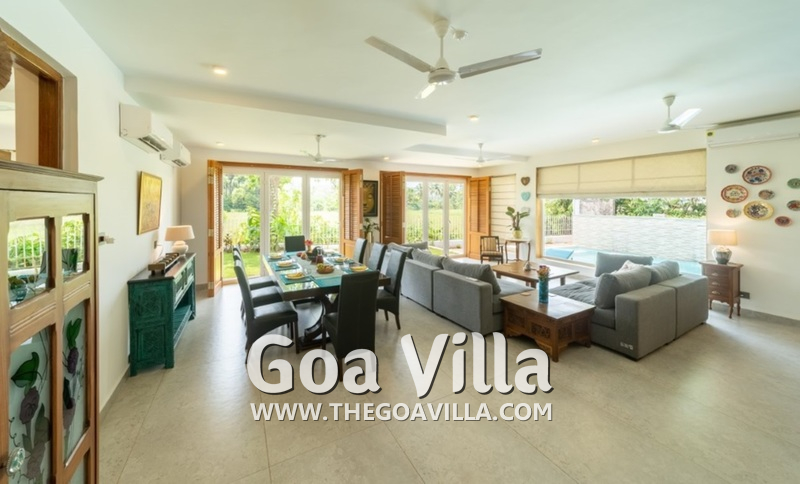Living Room – On entering the home, you will reach a huge open-concept room, which has the living area on one side the dining place on the other. There is a large L-shaped comfortable sofa where all of you can sit and spend precious together time. Play a board game, catch up on the old times, or plan what to see and do in Goa. The walls are decorated with wonderful art pieces. One entire wall has a glass panel that offers views of the pool.