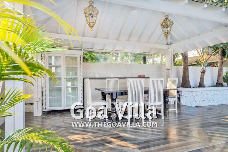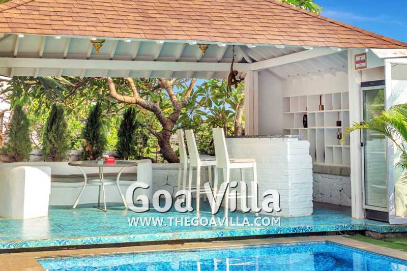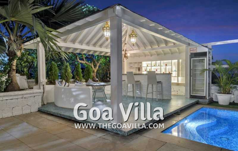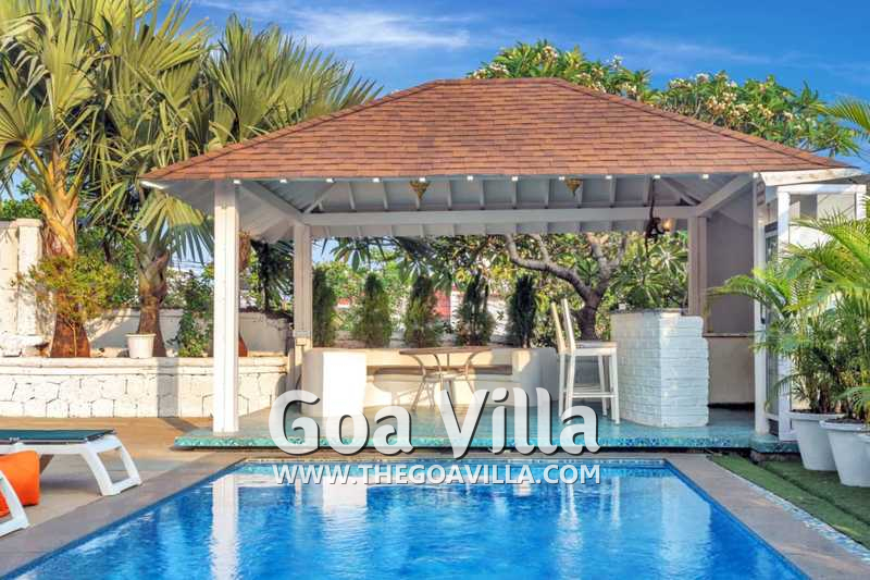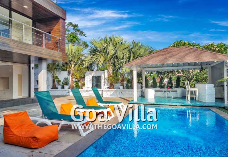 Swimming Pool – The private pool of Oceans Villa is a highlight of this luxury property in North Goa. The swimming pool is exclusively for you and your group for the duration of your stay. Several loungers are placed on the pool deck where you can relax and enjoy the views. It has two shaded areas on either side. One has an outdoor bar with high stools and the second has an alfresco dining table. The poolside bar also has sofas with cushions for comfortable seating and a small table.