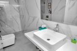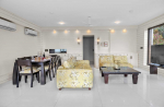 Living Room – The house is an intimate, tranquil oasis that is designed with soothing whites and sophisticated furniture. Large windows create an ambience of airy space. It has an open-concept design with the living and dining spaces both a part of the same room. However, because of its big size, the room doesn’t feel cramped. The living area has comfortable sofas facing a huge television. A glass sliding door opens to a sea-facing balcony. The other side of this room also has a floor-to-ceiling glass panel that overlooks a garden.