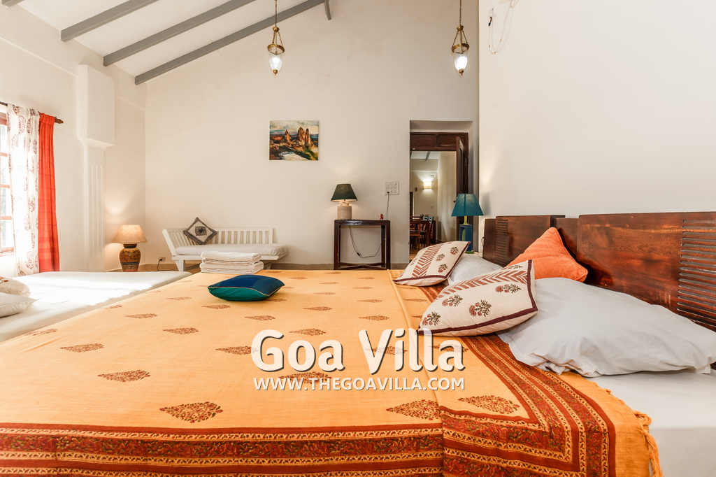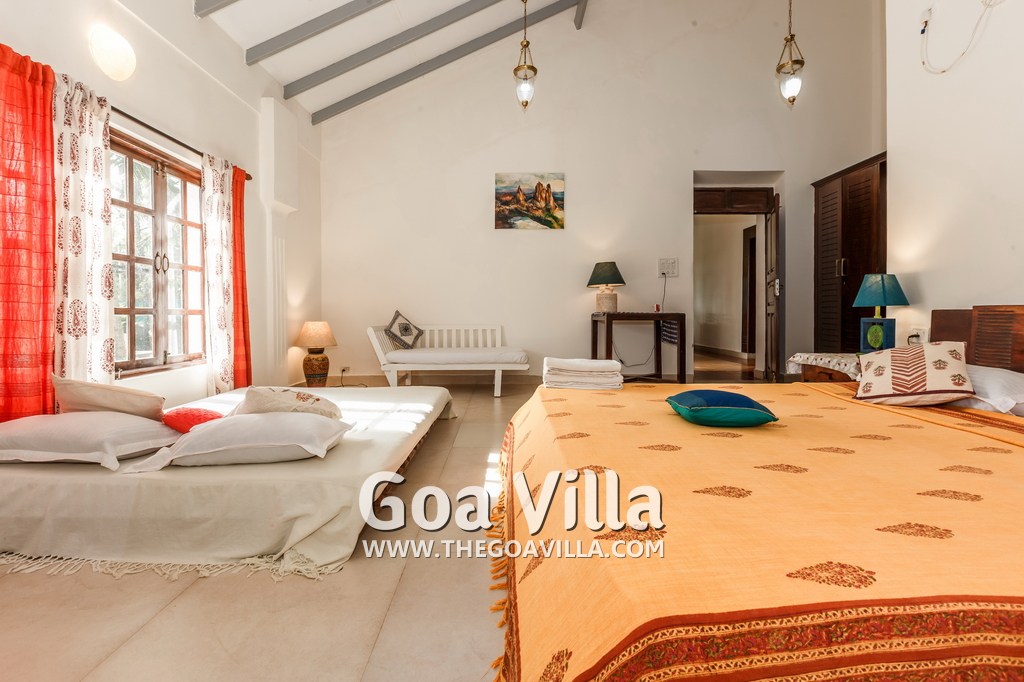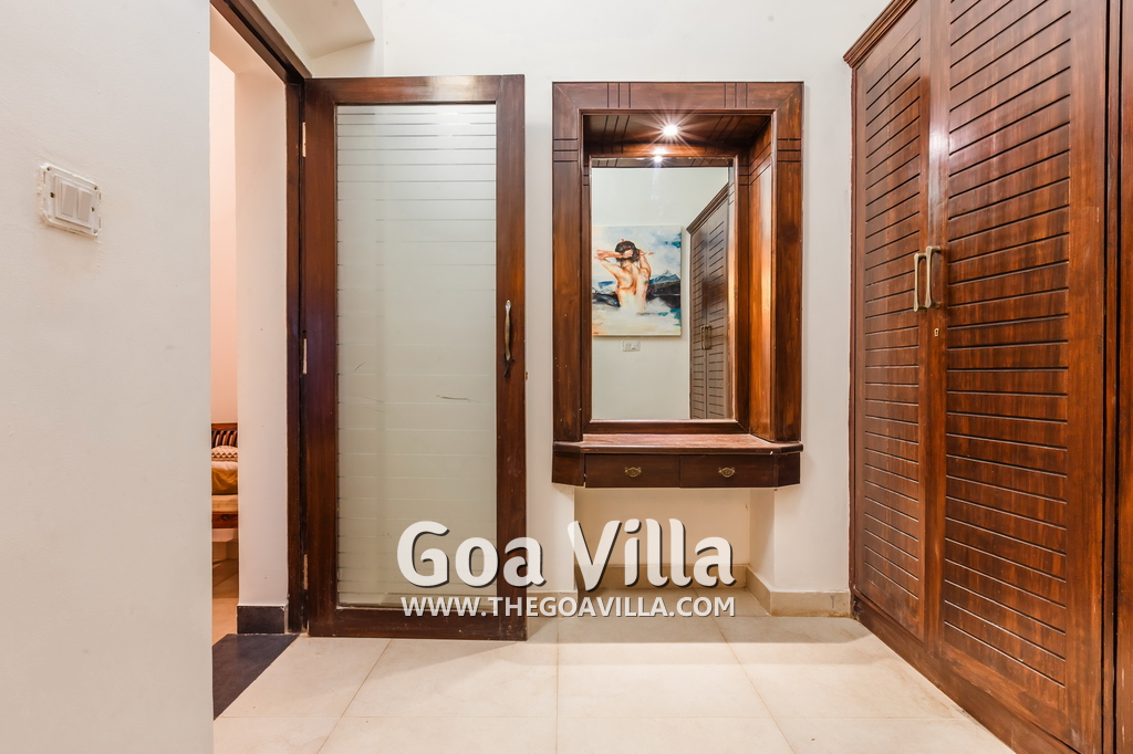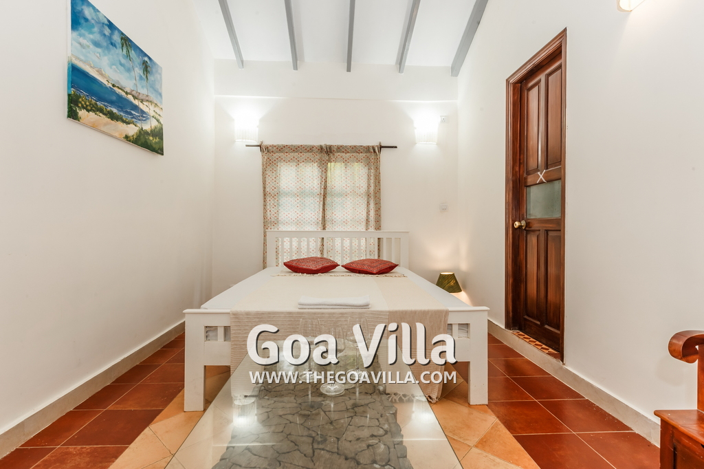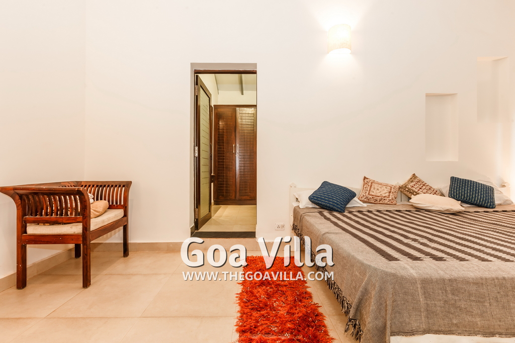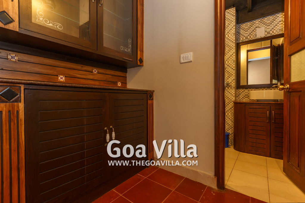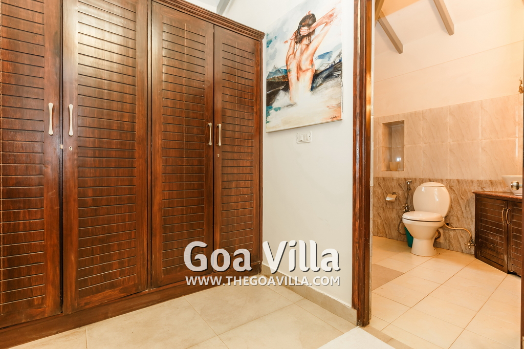 There is a #5th bedroom at this villa in Calangute and it is in the main building. However, this room is between the living room and kitchen, and does not have a door. It can be a good bedroom for kids or men. Comfortable large bed, modern cabinet. Tiled flooring. Beautiful toilet.