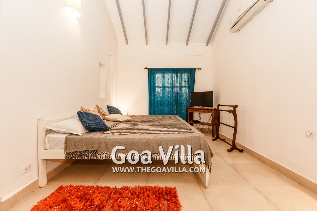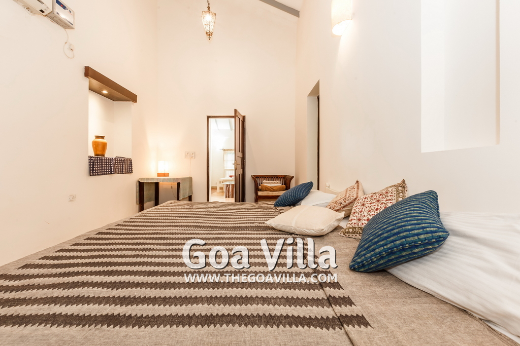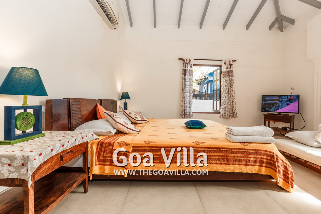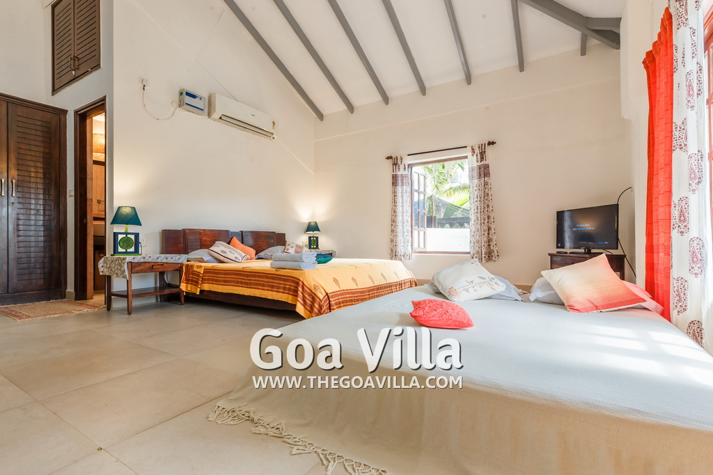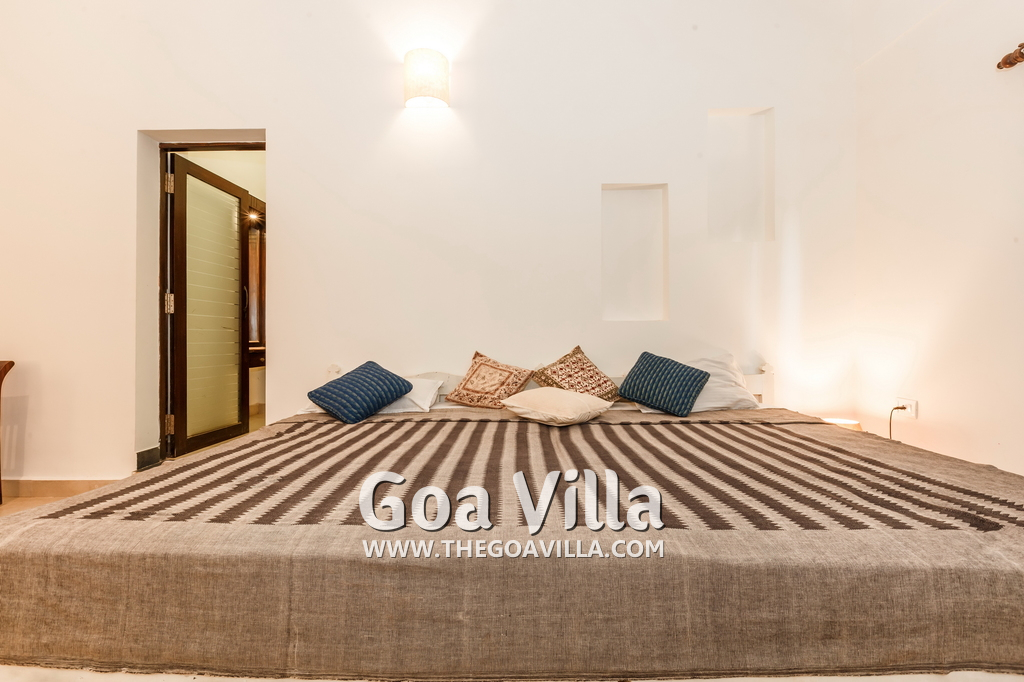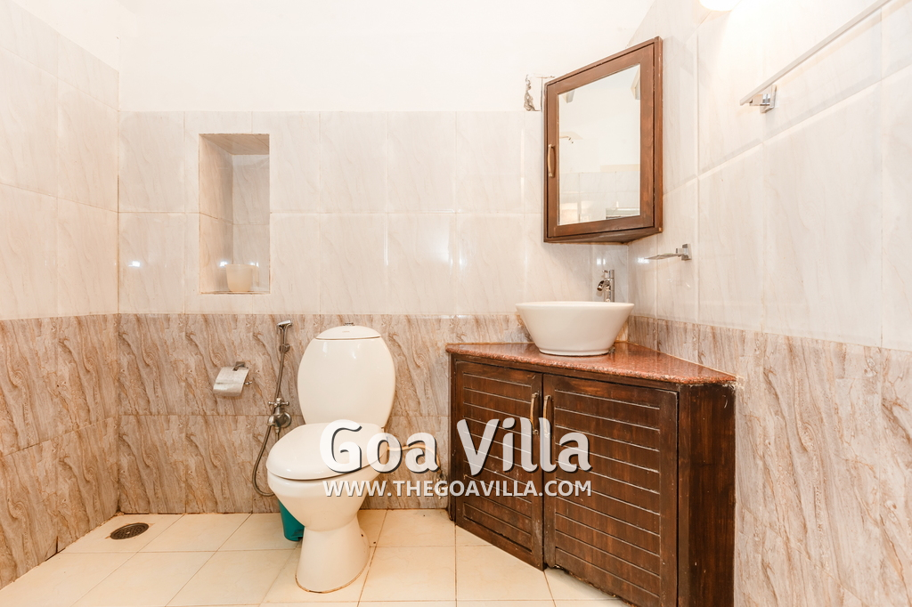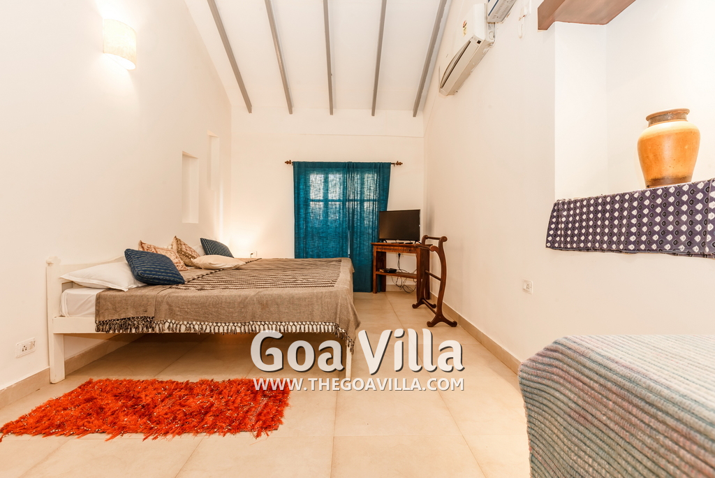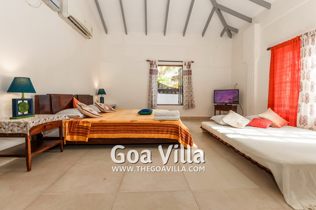 There is a #5th bedroom at this villa in Calangute and it is in the main building. However, this room is between the living room and kitchen, and does not have a door. It can be a good bedroom for kids or men. Comfortable large bed, modern cabinet. Tiled flooring. Beautiful toilet.