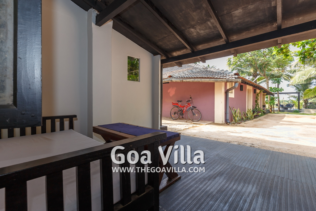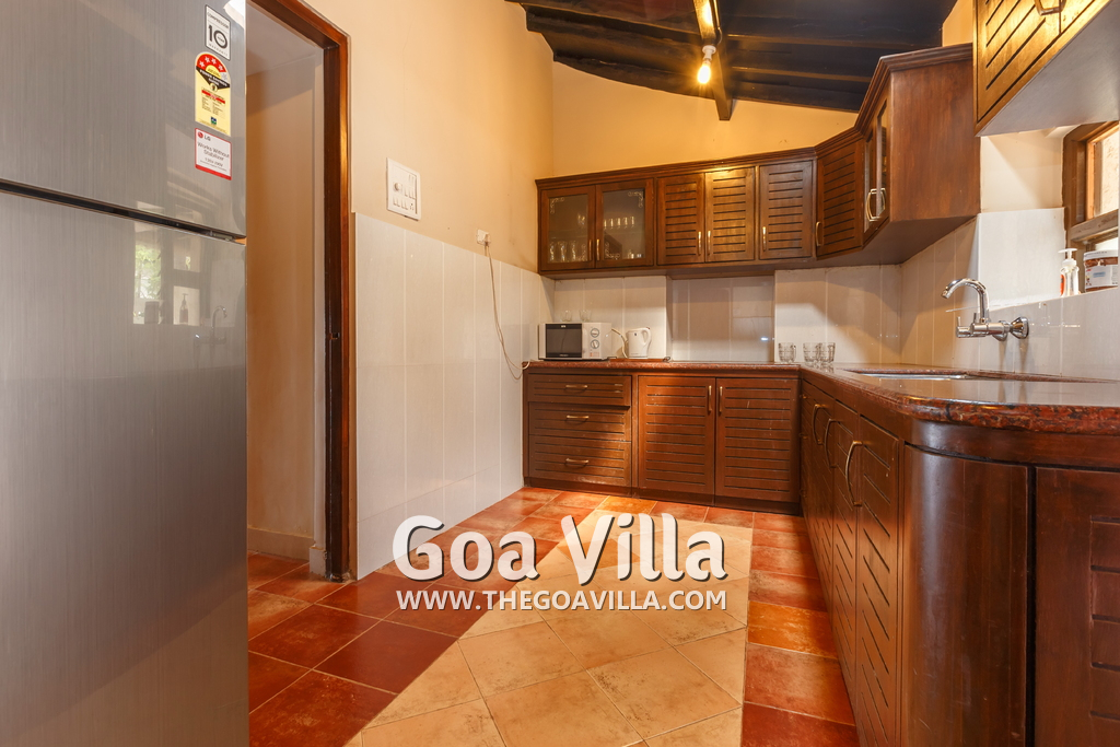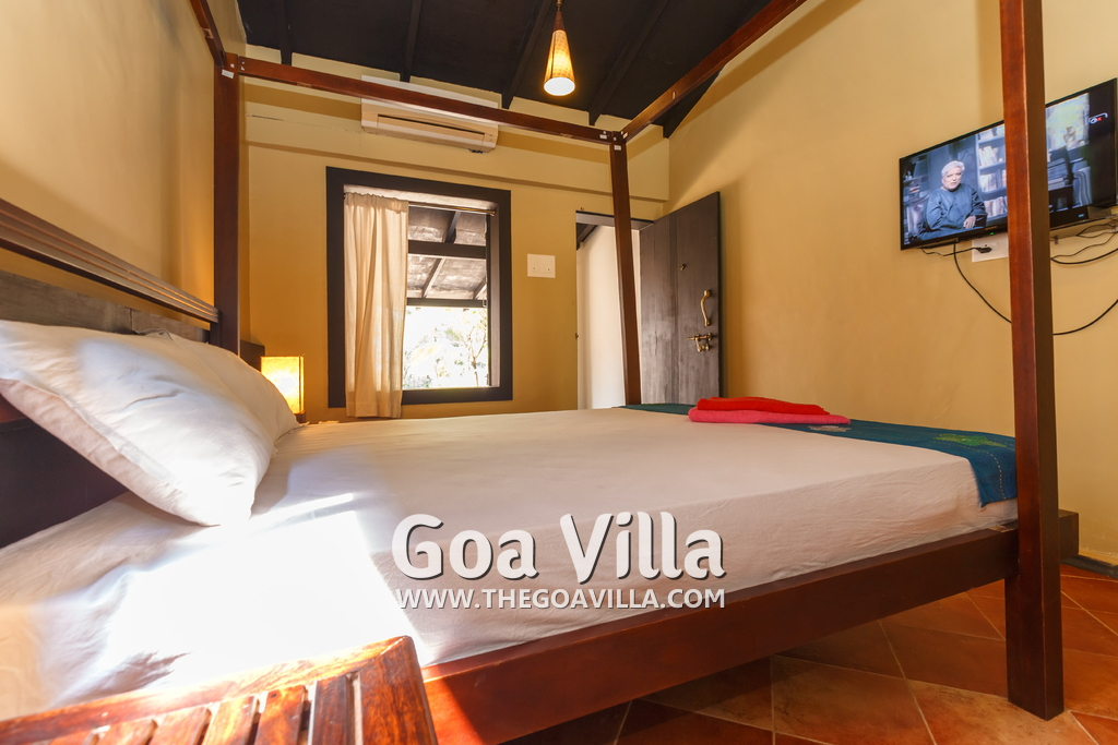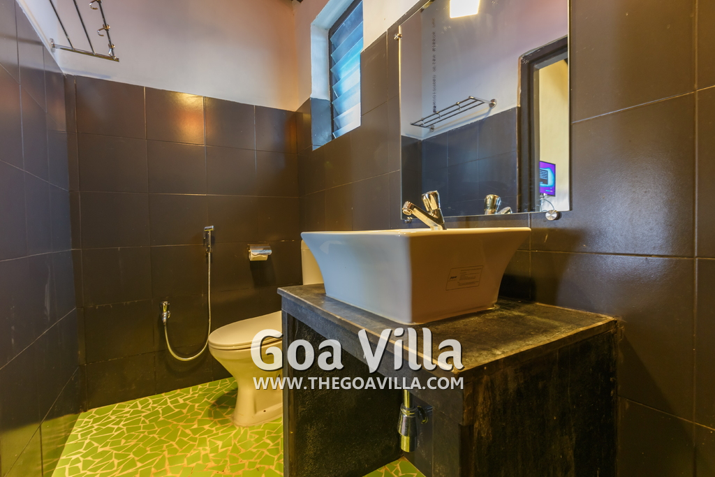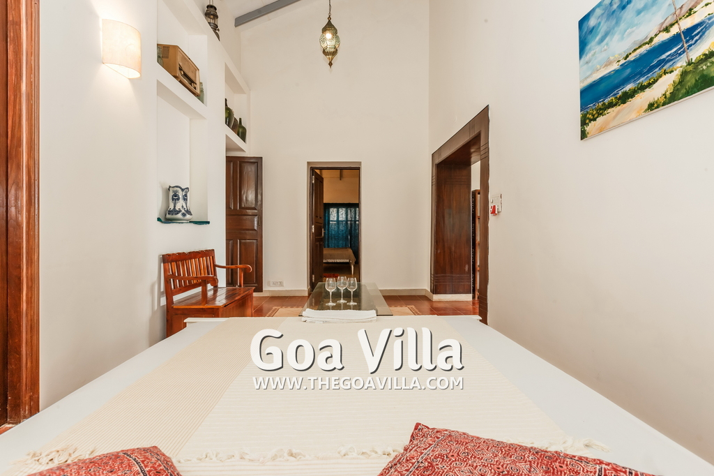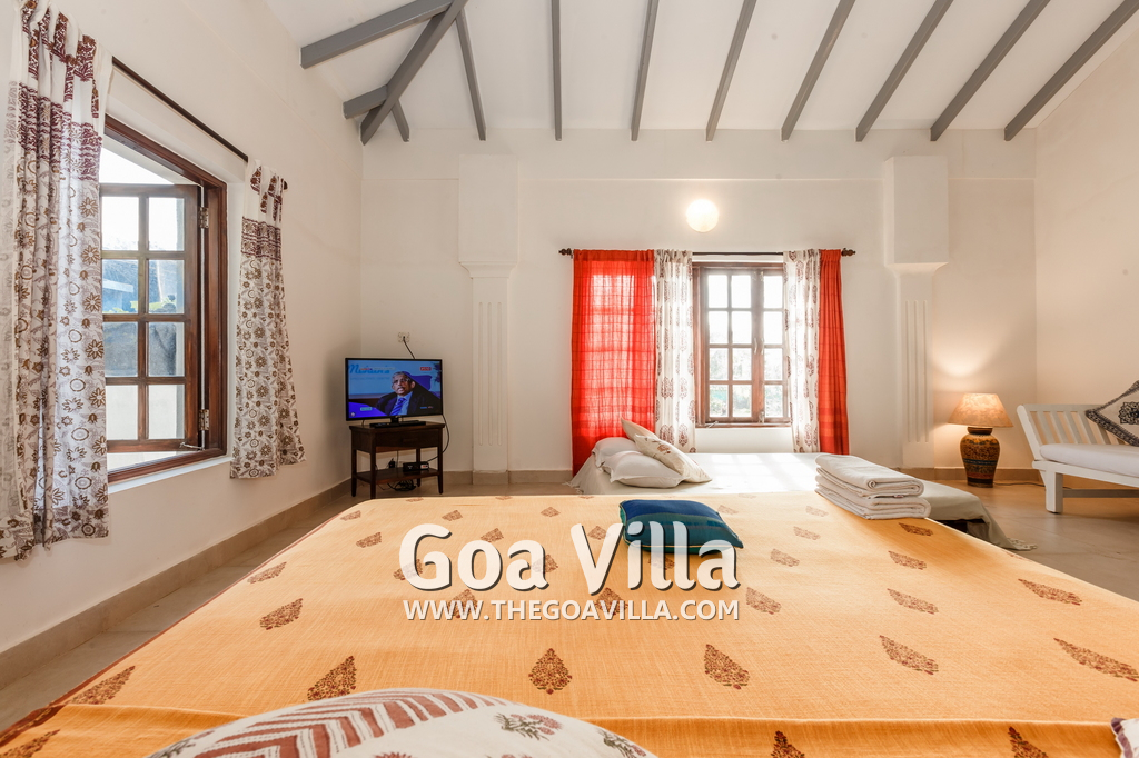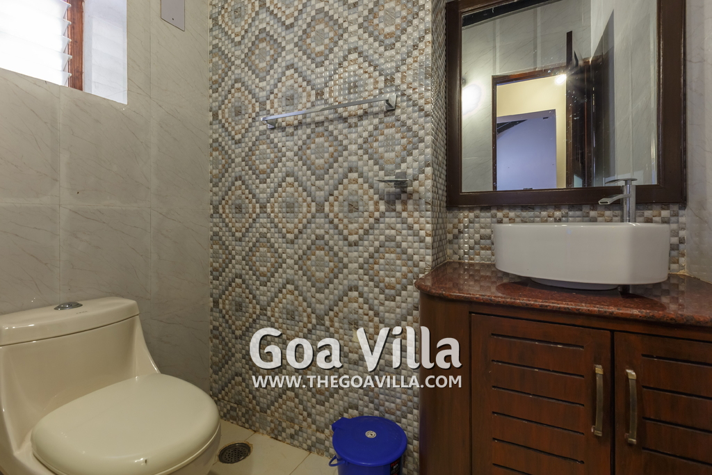 There is a #5th bedroom at this villa in Calangute and it is in the main building. However, this room is between the living room and kitchen, and does not have a door. It can be a good bedroom for kids or men. Comfortable large bed, modern cabinet. Tiled flooring. Beautiful toilet.