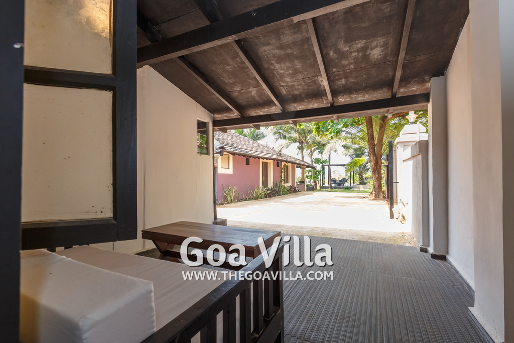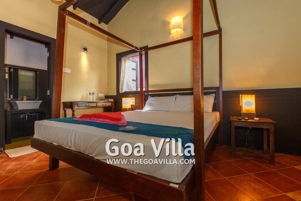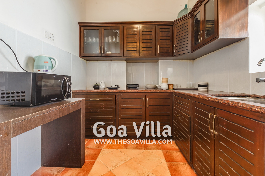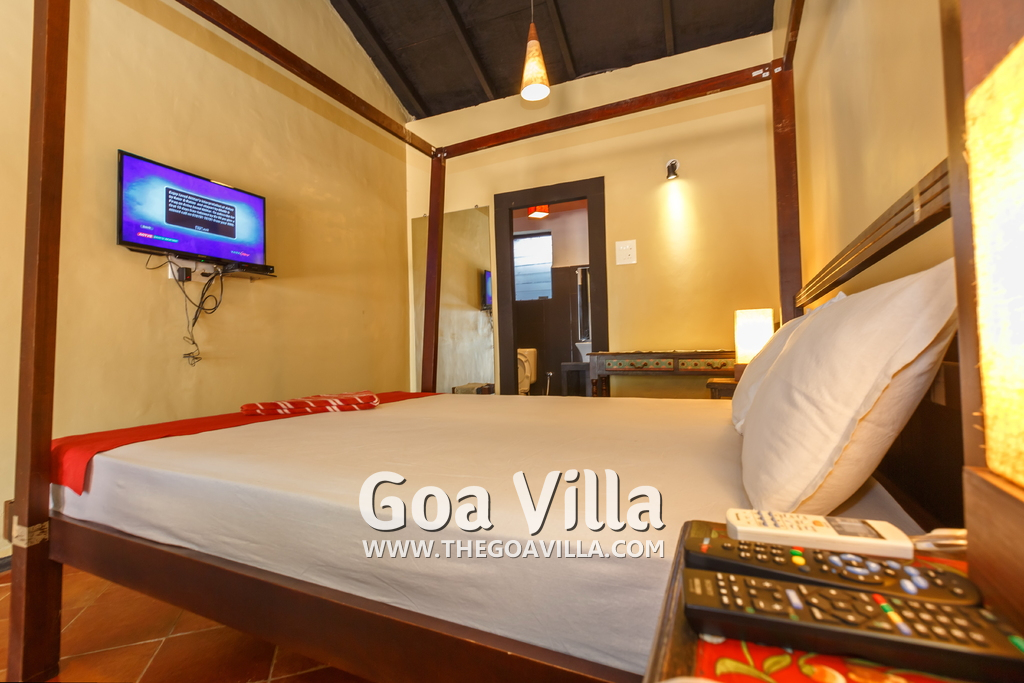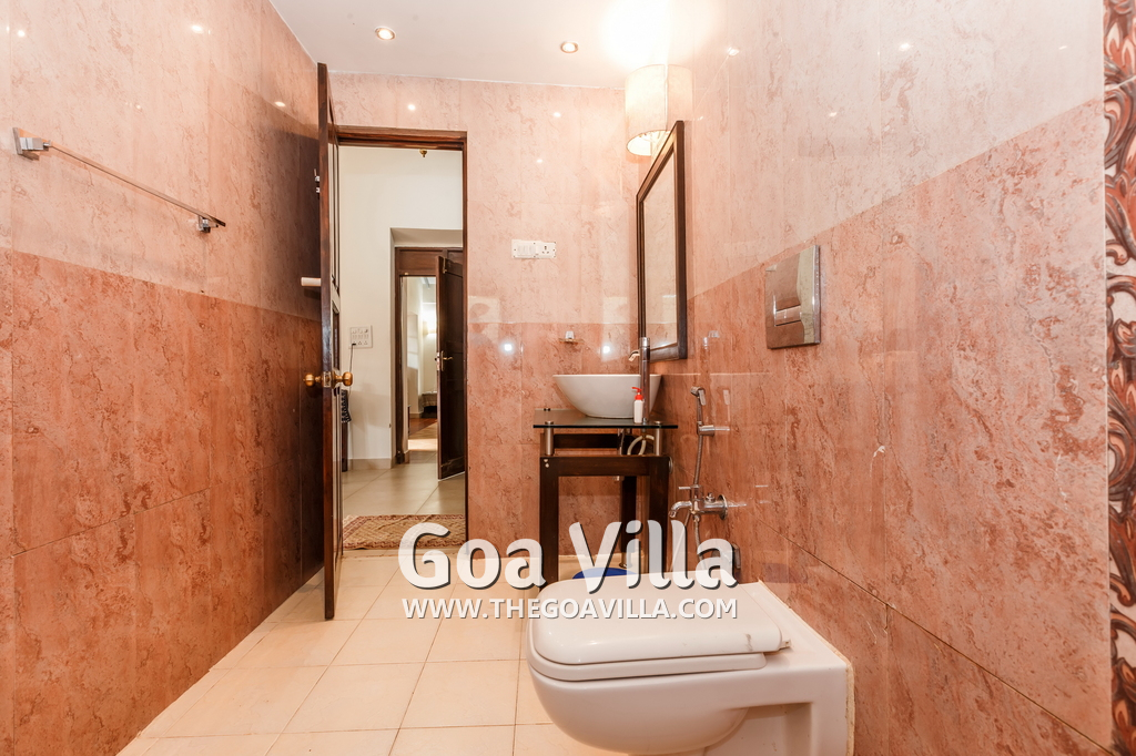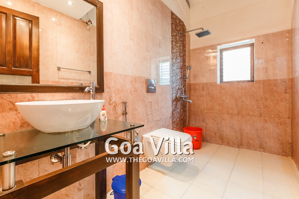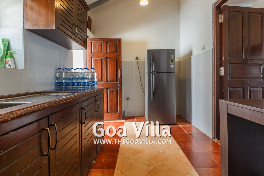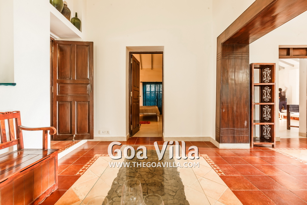There is a #5th bedroom at this villa in Calangute and it is in the main building. However, this room is between the living room and kitchen, and does not have a door. It can be a good bedroom for kids or men. Comfortable large bed, modern cabinet. Tiled flooring. Beautiful toilet.