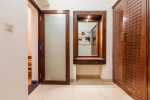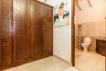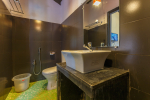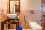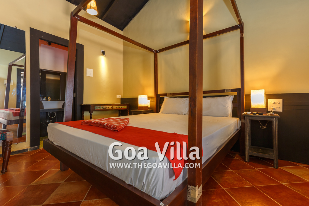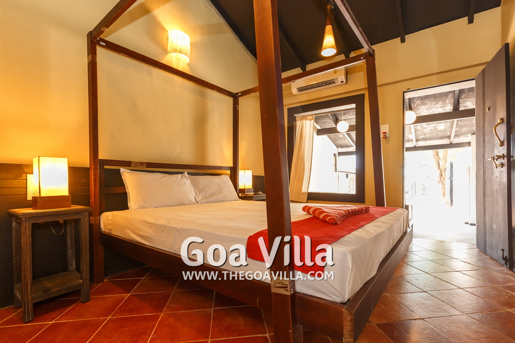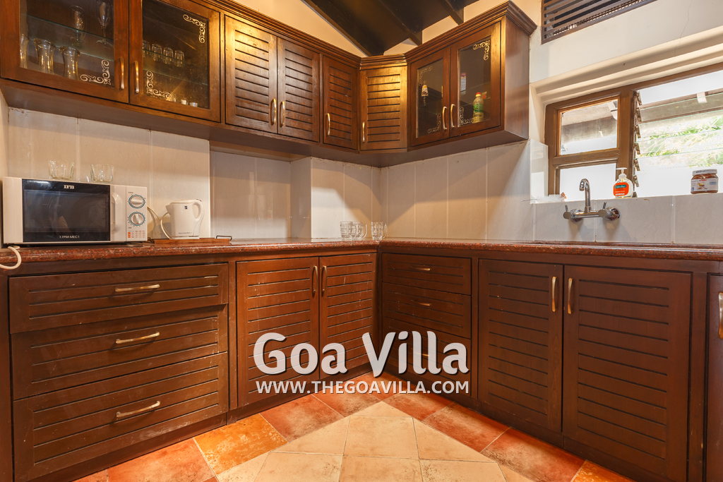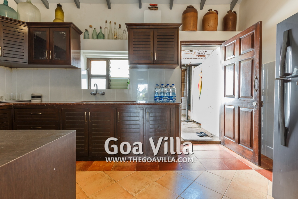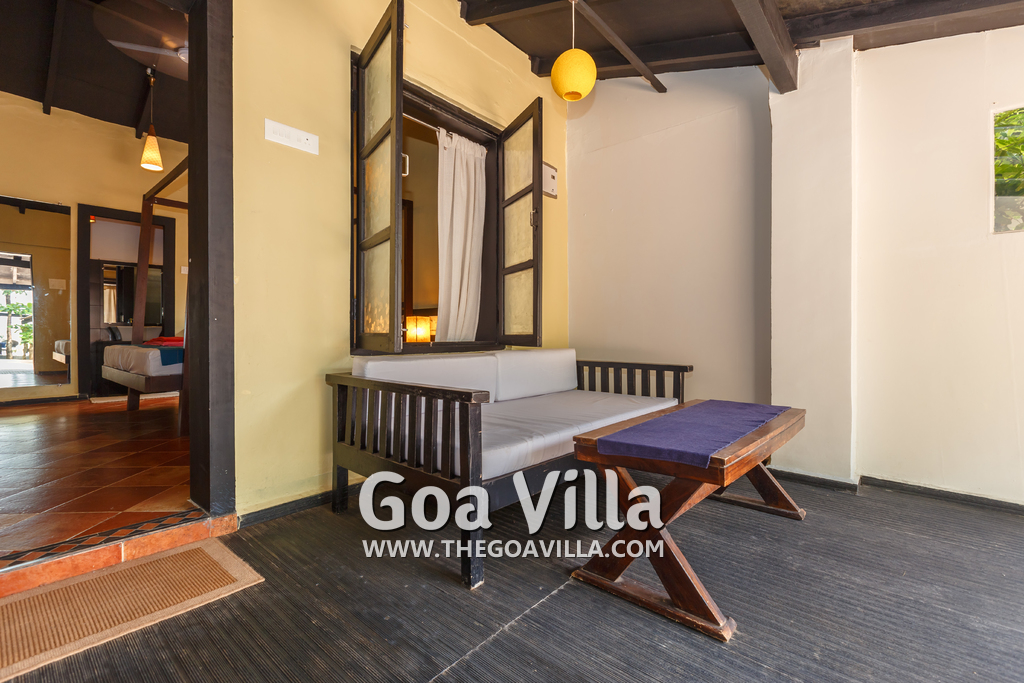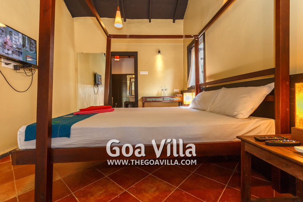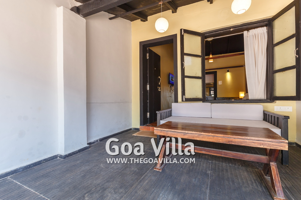 There is a #5th bedroom at this villa in Calangute and it is in the main building. However, this room is between the living room and kitchen, and does not have a door. It can be a good bedroom for kids or men. Comfortable large bed, modern cabinet. Tiled flooring. Beautiful toilet.