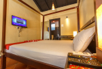 Bedroom #3 in the cottage. Beautiful décor. A warm bed, side table with lighting, television on the wall. A cozy verandah just outside to watch nature.