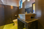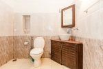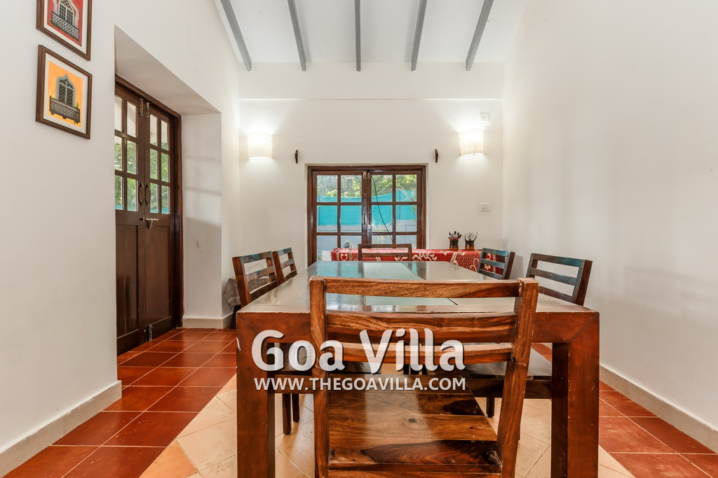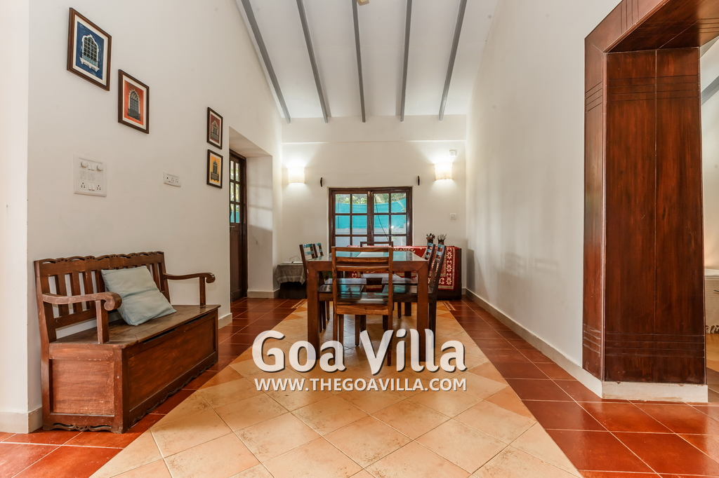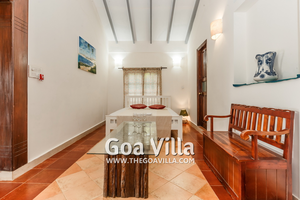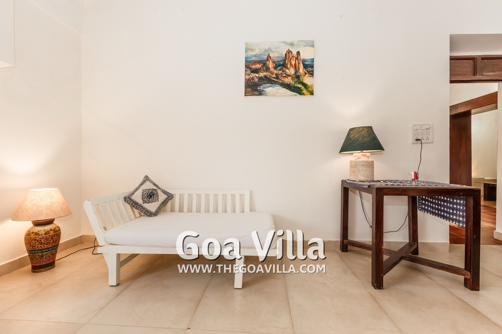 There are 4 en-suite bedrooms in this villa for rent at Calangute, and a fifth bedroom, which is on the way to the kitchen. It is between the living room and the kitchen in the main building. The fifth room too has all the comforts and amenities but there is no door, so it will be best for kids or men. The bedrooms are air conditioned, have large comfortable beds, modern furniture, beautiful lighting and a sitting area. Open the windows and the sea breeze comes in, as the villa sits next to the Arabian Sea. You can see the garden and the swimming pool.