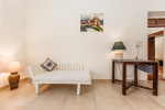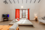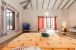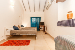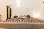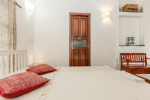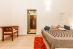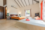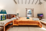 Bedroom #1 in the main house. Next to the living room, and facing the swimming pool and garden. Low comfortable bed with side table. Television. Comfortable chairs. Bathroom with modern faucets.