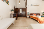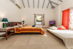 This villa in Calangute offers direct access to the beach. It is a little off the main road to the beach, the Holiday Street, so the place is nice and quiet. Calangute can get crowded, particularly in the peak season, but there are always fewer people in the immediate neighborhood. The villa has 2 buildings – the main house with the private swimming pool and a cottage. There is an outdoor gazebo. The rooms are comfortable with modern furniture.
