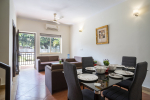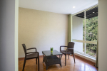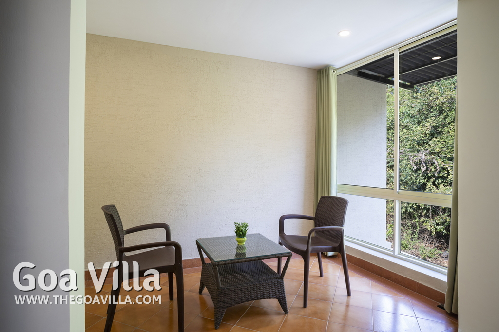 Living Room – Each holiday villa for rent in this community has a living room that overlooks the garden and swimming pool. There is a sofa and center table. Paintings on the wall. Small balcony outside.