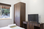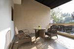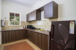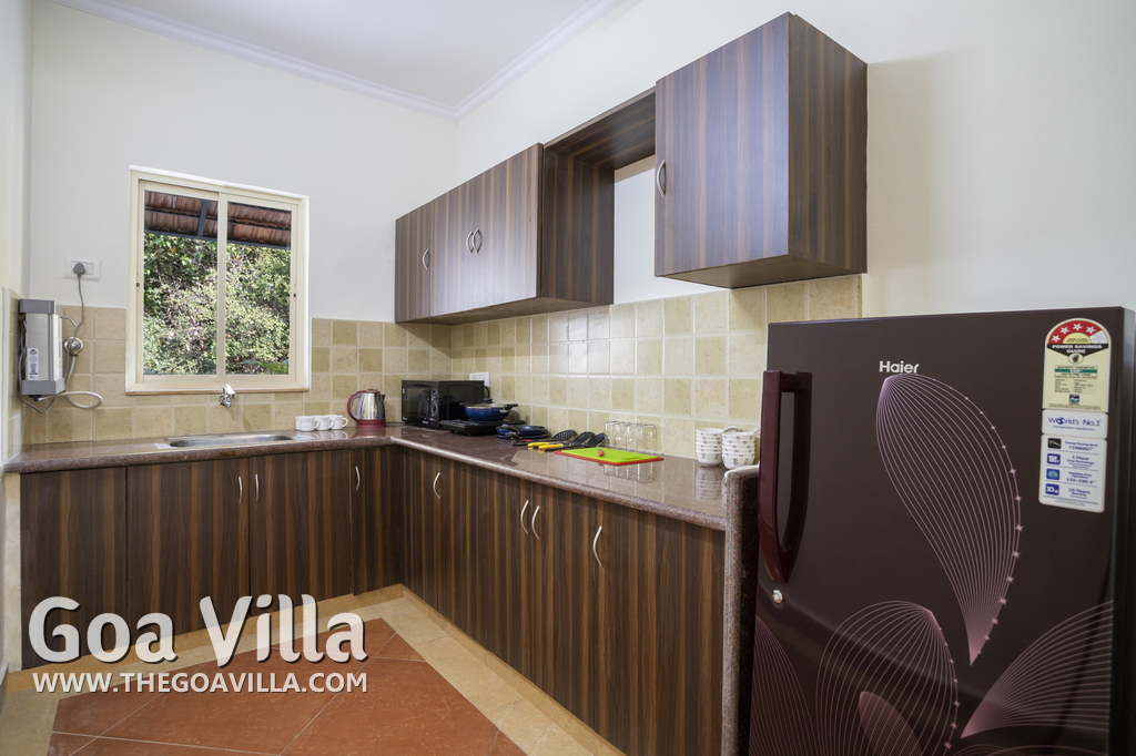 Kitchen, Dining – Each villa has a fully equipped kitchenette. Guests can use the large refrigerator, microwave, and water purifier. All cookware and tableware is provided. The dining area is in the living room at one corner. There is a glass-top dining table with sitting for 4 guests.