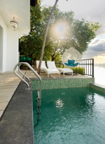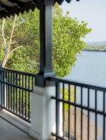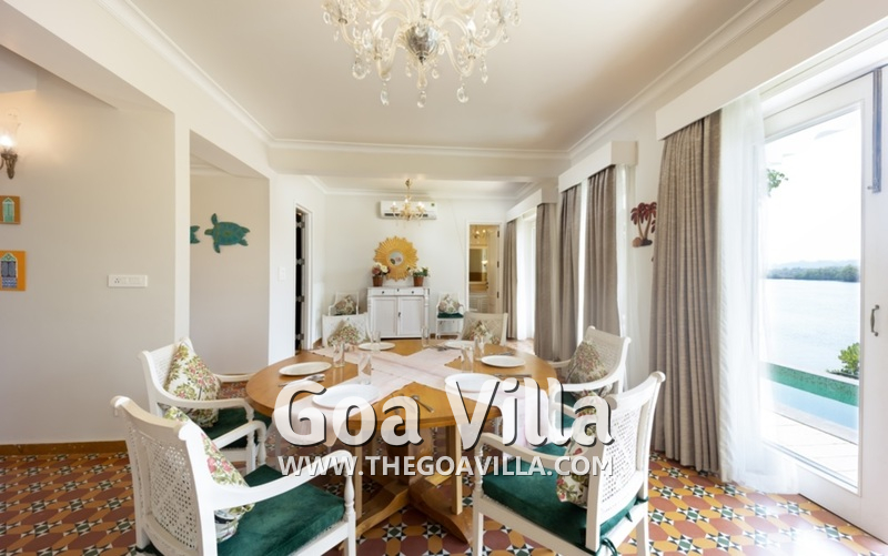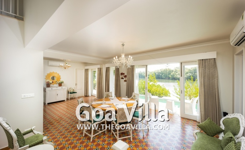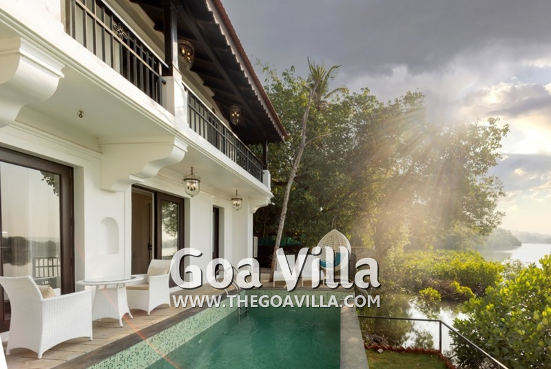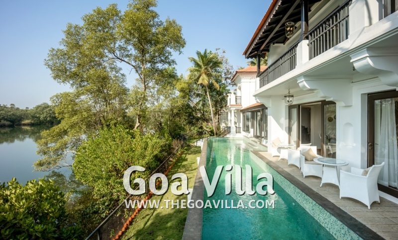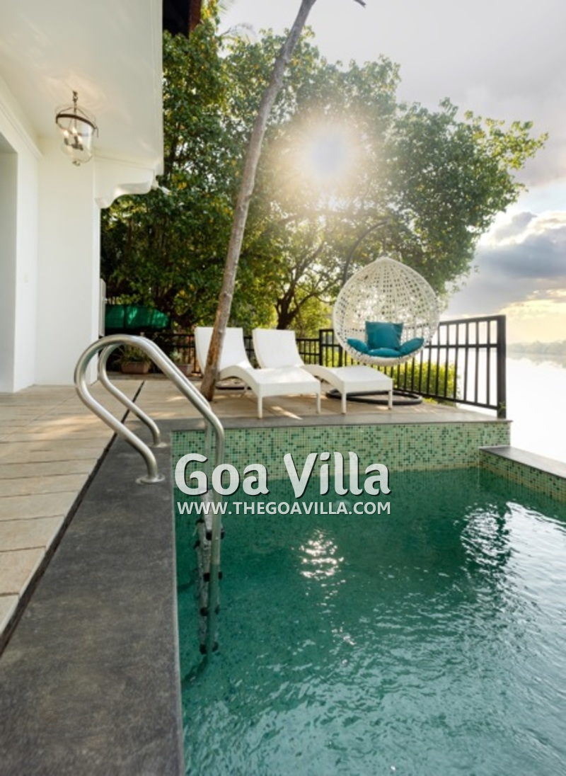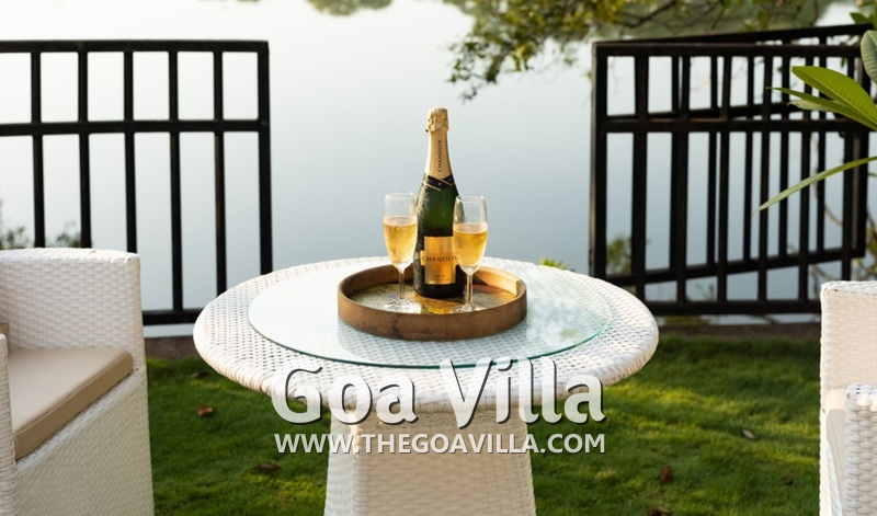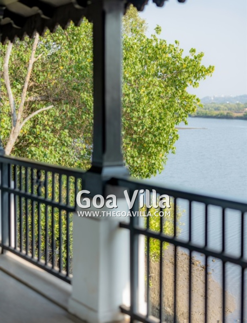 Swimming Pool – This North Goa luxury villa for rent has a fantastic river-facing private pool. It is small in size but still stands out because of its fabulous location. The pool deck has loungers, chairs, and tables, so you can relax or eat snacks while enjoying the views. One tier lower, there is a green patch that faces Nerul River and on the backside away from the river, you will find a much bigger lawn and garden with several seating areas.
