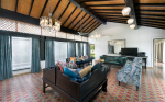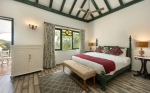 Living Room – The stylish interiors feature subdued colors and hardwood furnishings. Everything is placed in a very aesthetic way. Wide doors and windows allow the house to blend with its surrounding landscape. The living room has an elegant sofa area, a large-screen television, and a music system for your entertainment. Various objects of art decorate the space. The property promotes a live-in, live-out concept, so this room opens directly toward the pool area and the river. This room also features traditional terracotta flooring and a wooden-beamed ceiling.