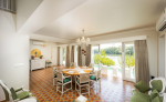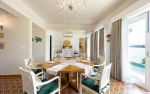 Dining, Kitchen – The formal dining space too faces the river. It has a semi-casual round table for 6 guests. Murals and sculptures decorate the walls. A staircase goes to the upper level. The kitchen has an oven, microwave, refrigerator, toaster, kettle, and a water filter.
