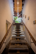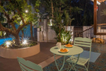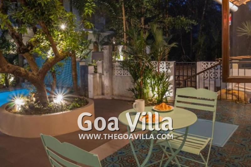 Swimming Pool – The outdoor area of this North Goa rental property is enveloped by chikoo and mango trees, tropical plants, and flowering bushes. The courtyard by the pool is a large open space with poolside dining, lounge chairs, and multiple seating options for everyone both under the sun and shade. The courtyard has an outdoor dining area too. The caretaker’s room is outside the main house, which gives you more privacy.