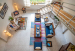 Living Room – Villa Rosewoods has a sunny and charming living room, which takes up most of its ground floor. You will immediately feel its welcoming vibe as soon as you enter. The wooden sofa is gathered around a modern coffee table. There are armchairs as well. The staircase to the upper level is located next to this sofa. The first floor landing has another lounging area with a second sofa. There is a third lounging space with antique chairs.