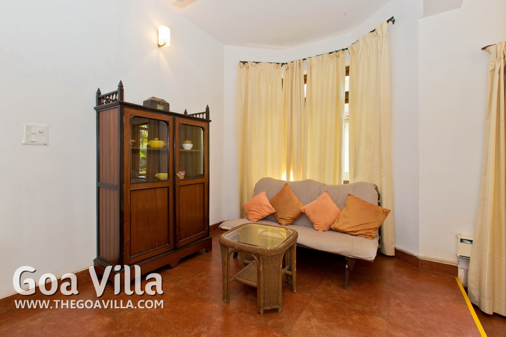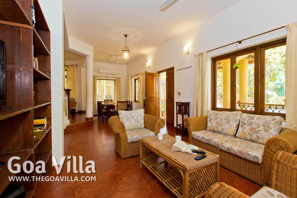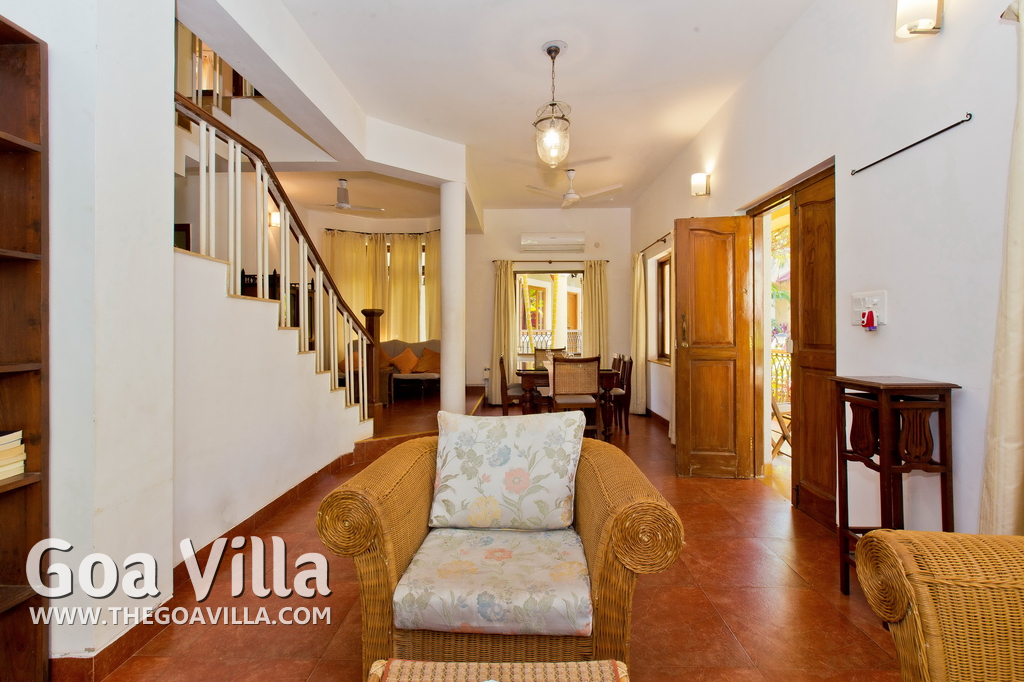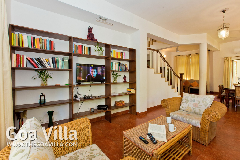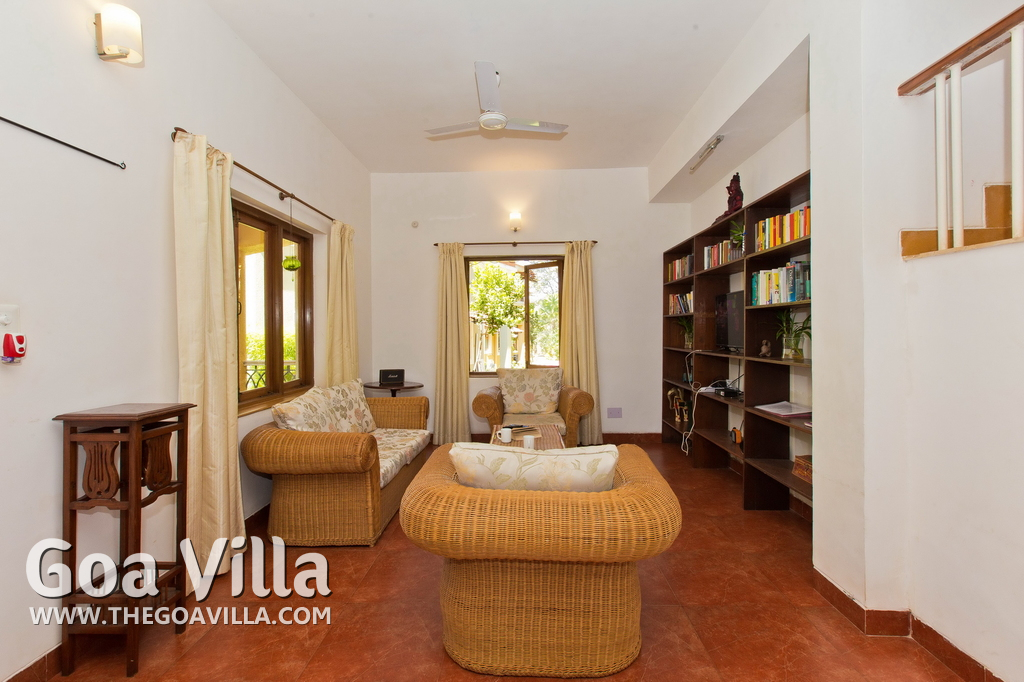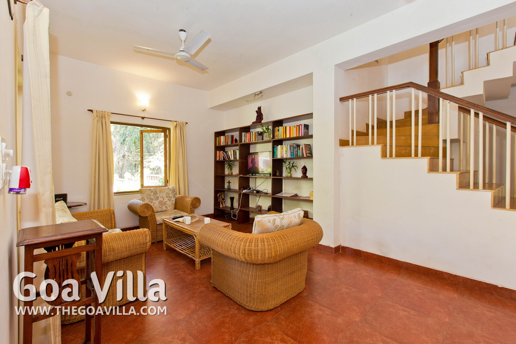 Living Room – The ground floor living area is cozy and comfortable. There is a cane sofa, center table, all-mounted satellite television, sculptures, and a library. Staircase leads to the first floor from one side. Traditional Goan covered balcony just outside beside the swimming pool.