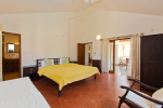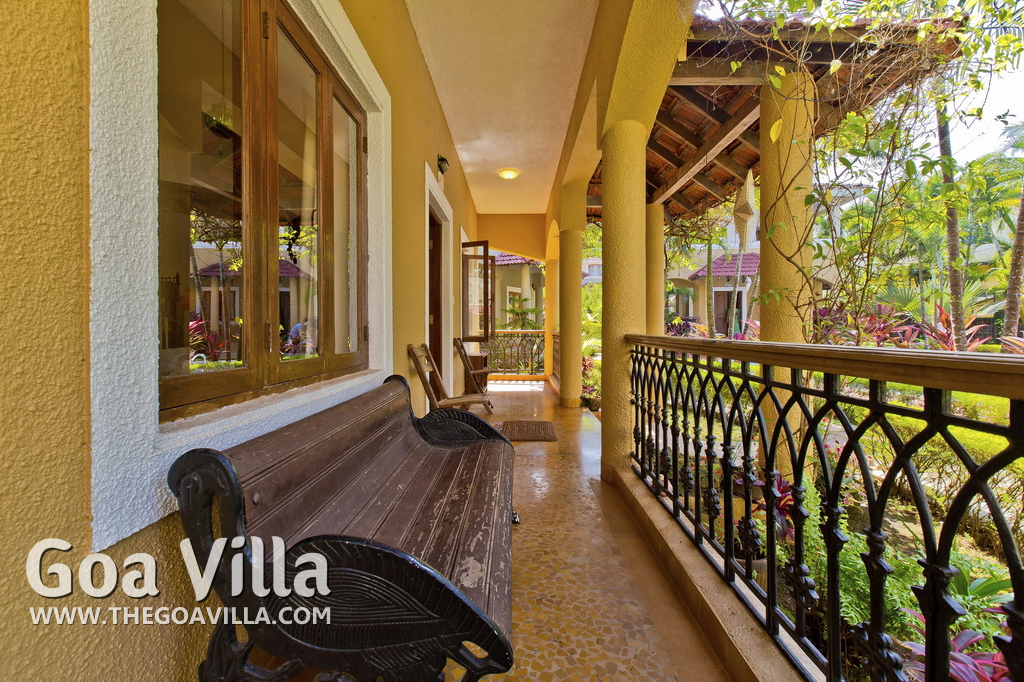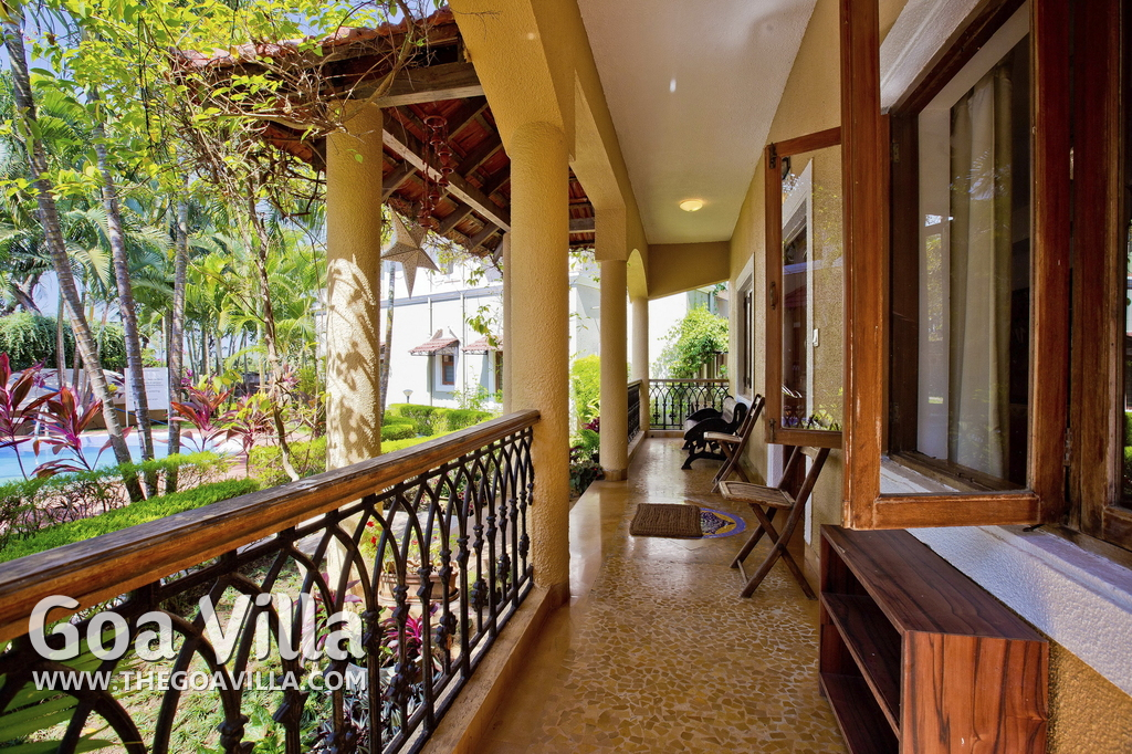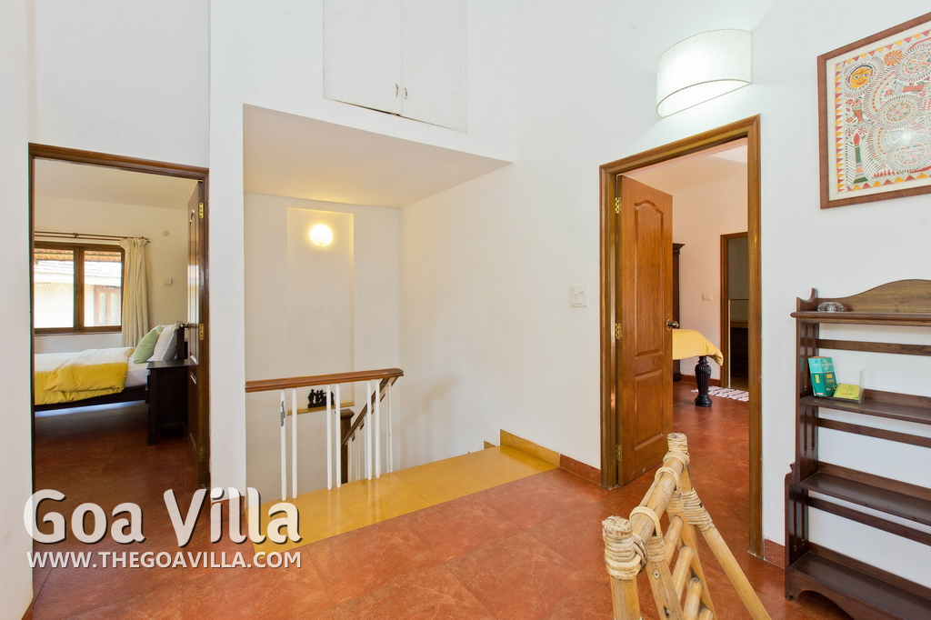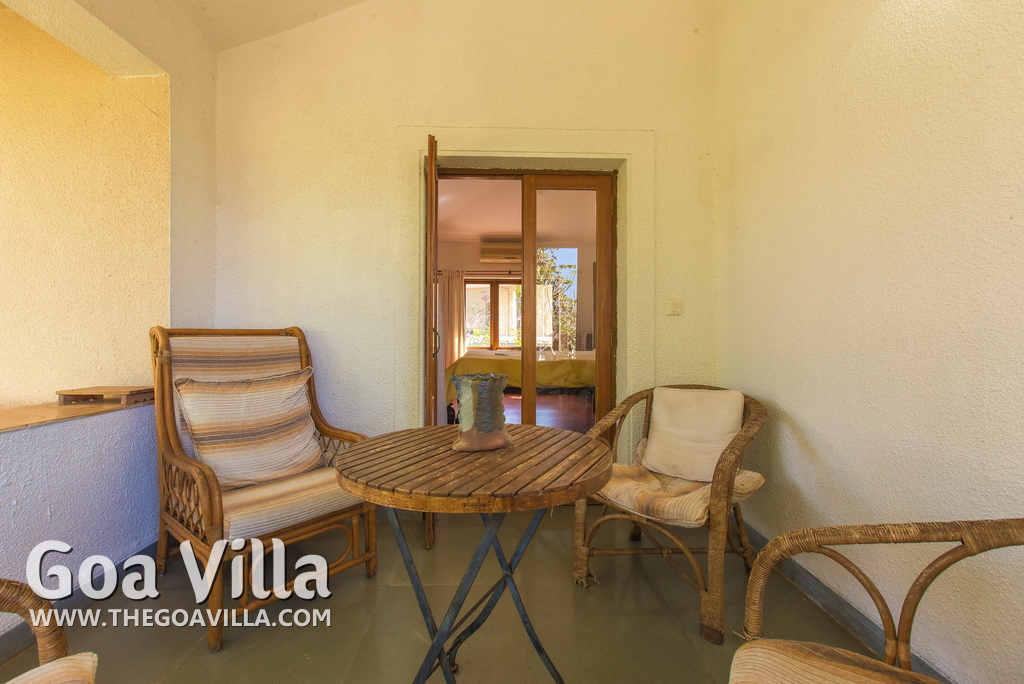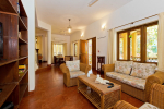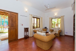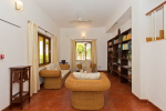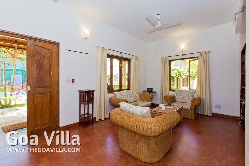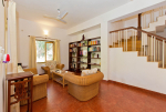Living Room – The ground floor living area is cozy and comfortable. There is a cane sofa, center table, all-mounted satellite television, sculptures, and a library. Staircase leads to the first floor from one side. Traditional Goan covered balcony just outside beside the swimming pool.