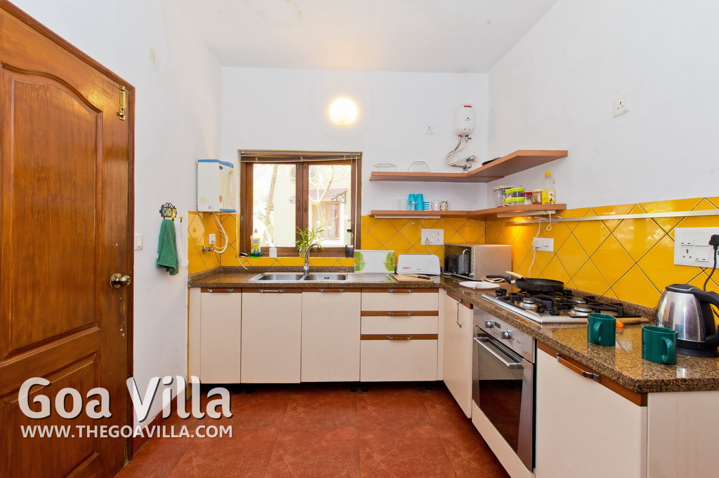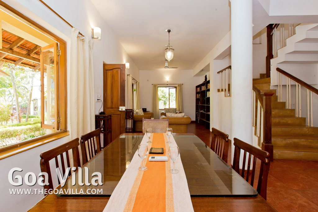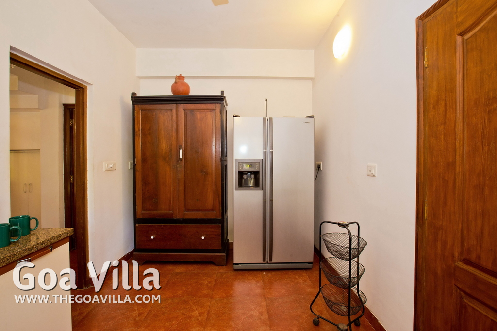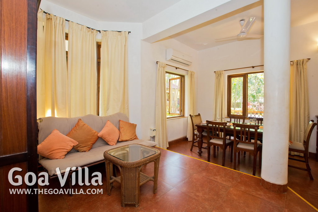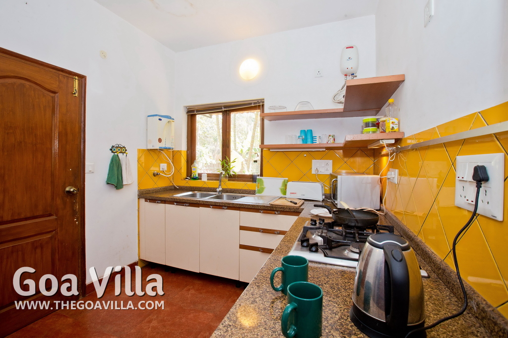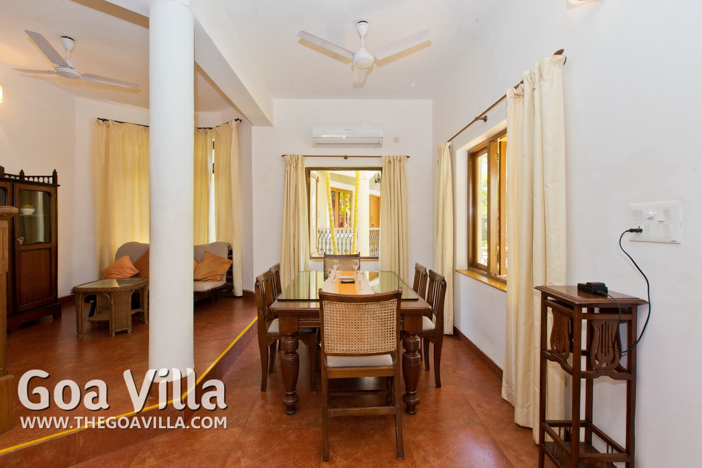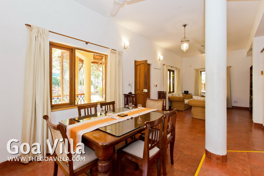 Kitchen, Dining – The dining area is at one side the living room beside a wide window. Glass-top table with sitting for 6 guests. This North Goa villa for rent also has a well equipped kitchen. You can use the large refrigerator, microwave, electric kettle, toaster, water purifier, and cooking station. Cutlery and cookware is provided.
